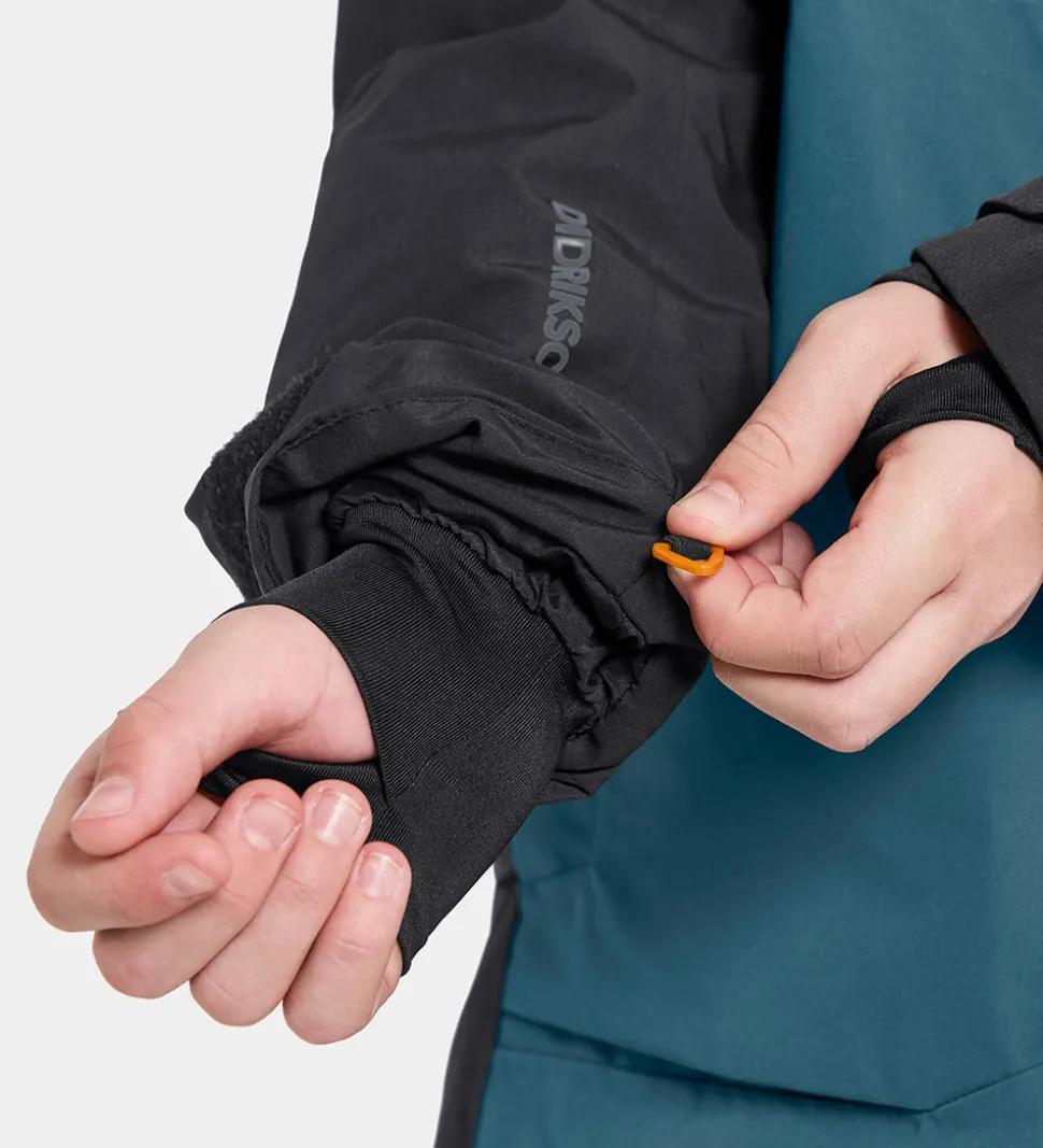 Didriksons vinterjakken har en aftagelig hætte, som er fæstnet med trykknapper og velcro langs den høje krave. Hætten har velcrojusteringer oven på hovedet og i siderne af ansigtsåbningen, og ansigtsåbningen har en skygge i toppen.Ved ærmerne er der praktiske snefang med brede, strækbare kanter med et lille hul til tommelfingeren, og ærmekanten kan strammes ind med en velcrorem. På indersiden ved ærmekanten er der en praktisk plast-ring, som Didriksons handsker og luffer kan hægtes på.