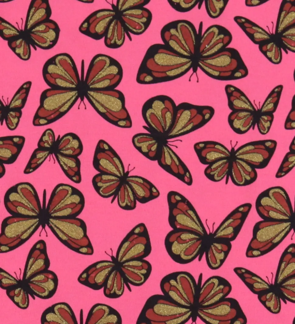 Smukke DYR leggings i en klar pink farve med et alloverprint af sommerfugle i sort, rød og guld glimmer. DYR leggingsene har en elastisk talje, der sikrer en god pasform.