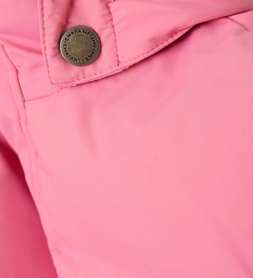 En Fant dynejakken har en aftagelig hætte, som sidder fast med trykknapper, og den har en smal elastikkant samt en lille skygge, som skærme for vind og vejr. Ærmerne har brede ribkanter.