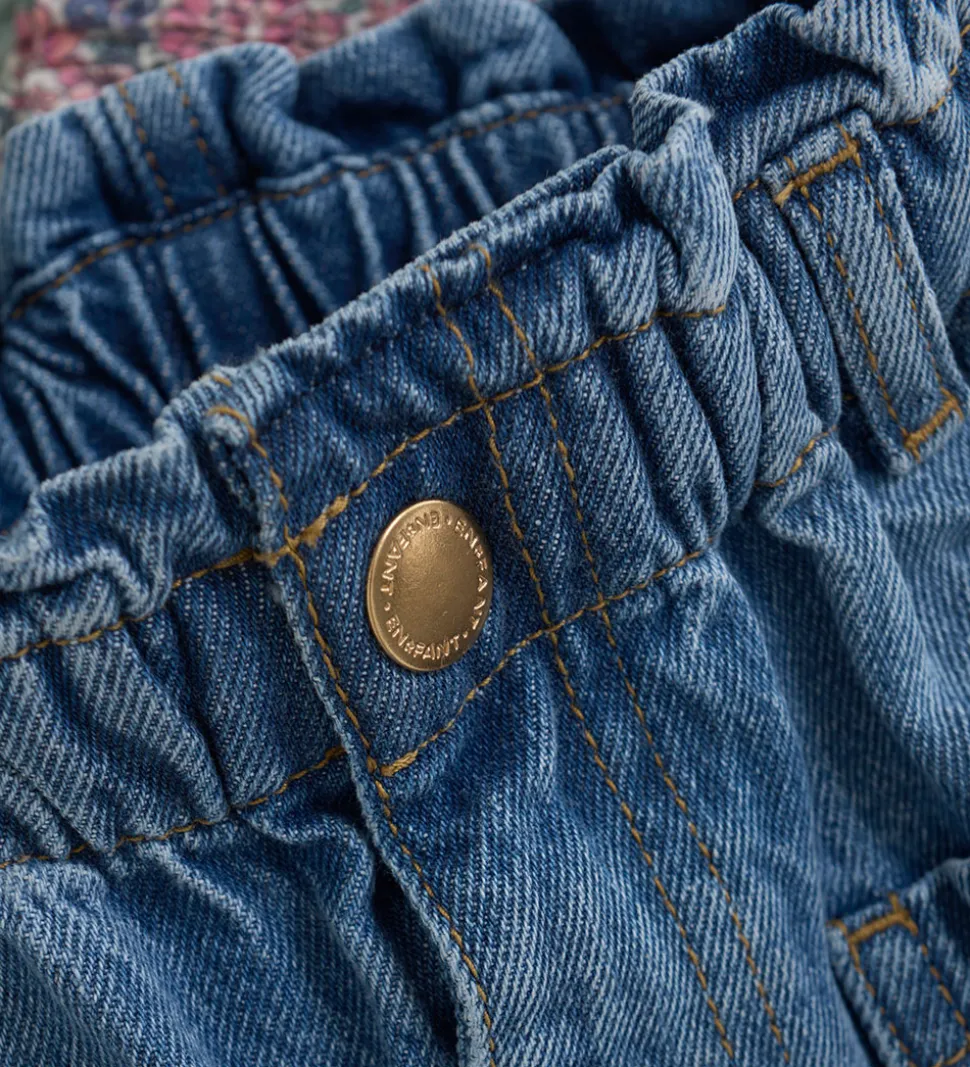 Flot En Fant nederdel i blå denim med to forlommer. En Fant nederdelen er en kort model med en elastisk talje, som kan justeres med knapper indvendigt. Den lukkes fortil med en trykknap og har praktiske bæltestropper.