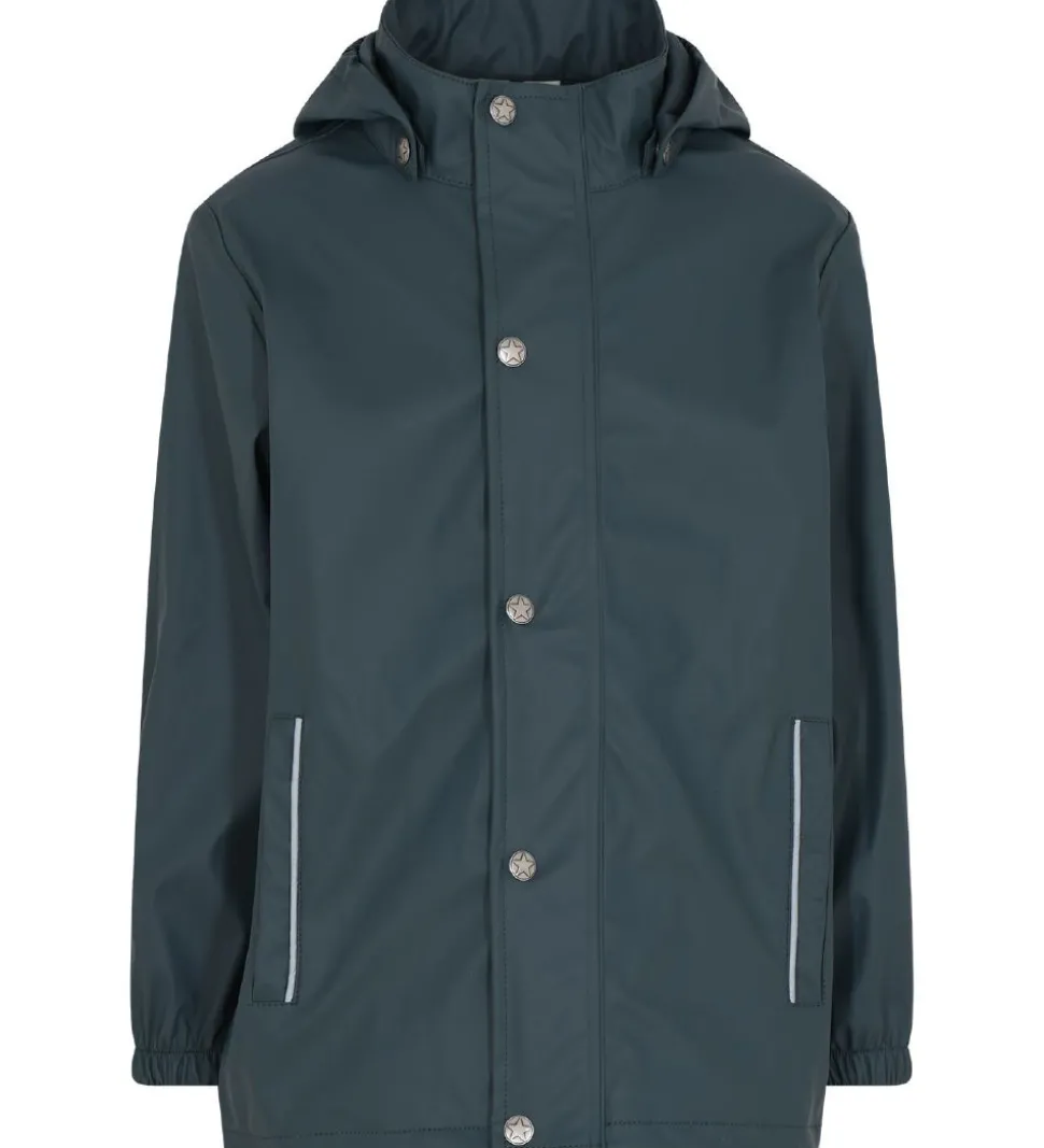 Lækkert En Fant regntøj i PU i støvet blå med sølvfarvede knapper. Regnsættet består af en regnjakke og et par regnbukser med seler.