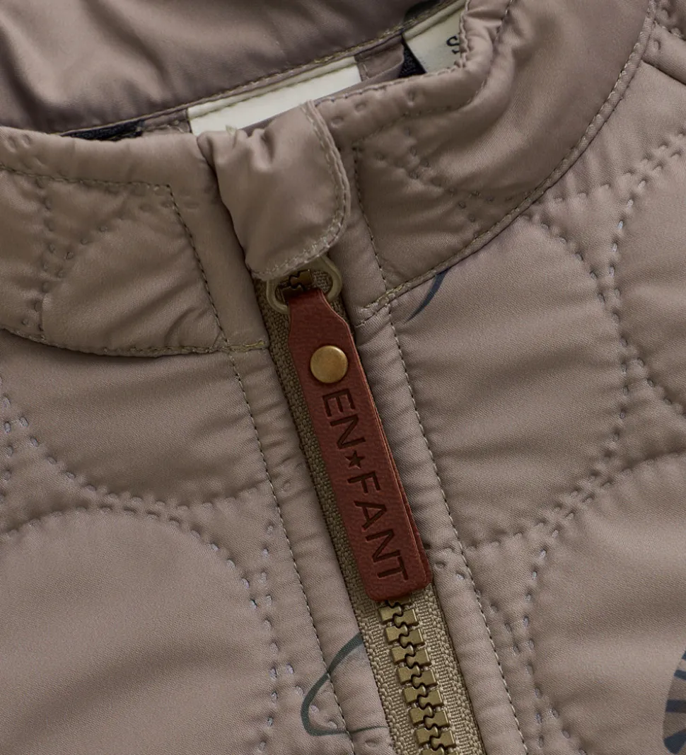 Fint En Fant termotøj i støvet brun med alloverdinoprint og med en indpræget, quiltet struktur i runde cirkler. Sættet består af en termojakke og et par termobukser.