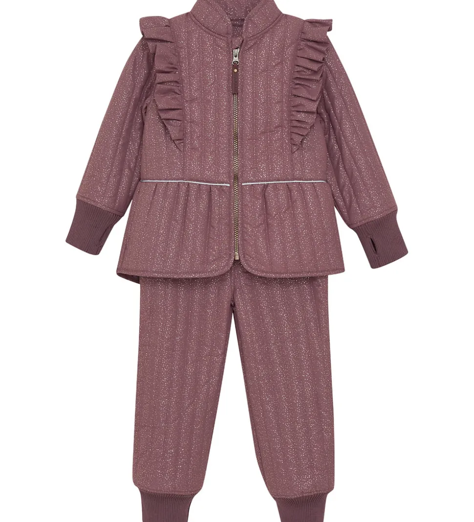 Fint En Fant termotøj i mørk rosa et allovermønster af guldprikker samt med en indpræget struktur i lodrette linjer. Sættet består af en termojakke med flotte flæser omkring skuldrene og et par termobukser.