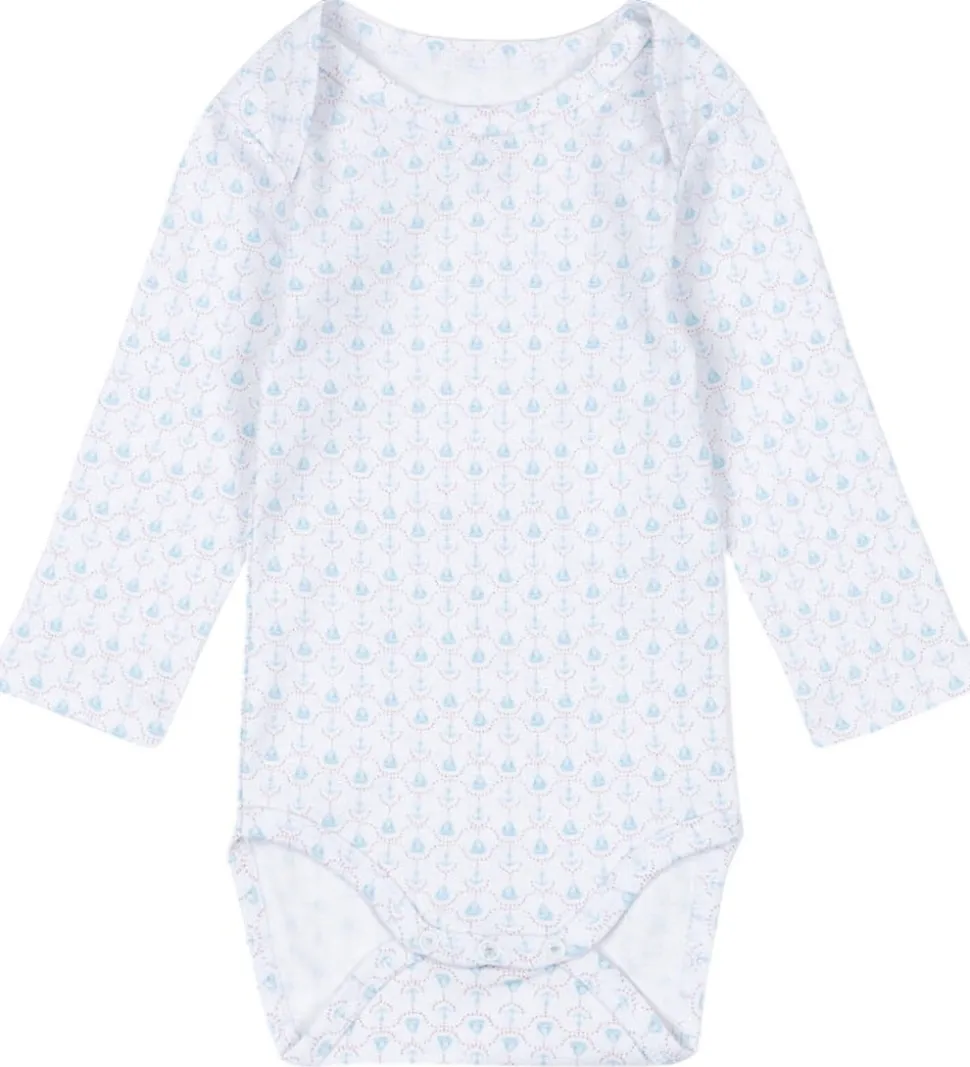 Fin Fanga Fontana body i hvid med lange ærmer og et delikat mønster af små, lyseblå skibe og røde prikker.