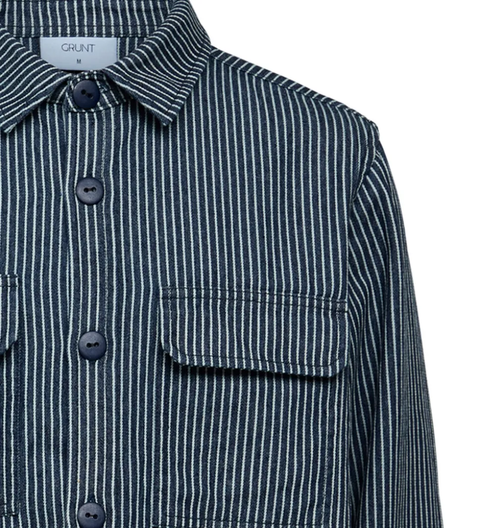 Smart Grunt skjorte i navy med smalle, lodrette striber i hvid. Skjorten er lavet i en fastvævet kvalitet.