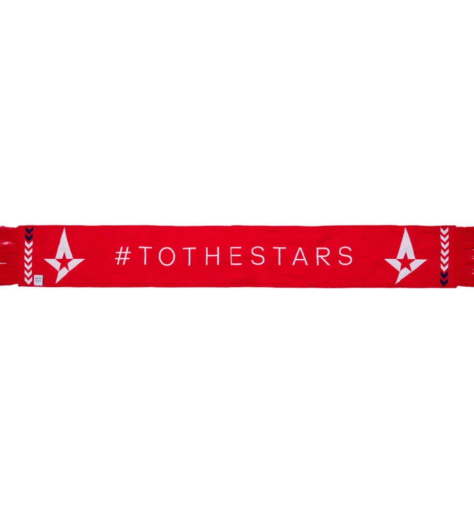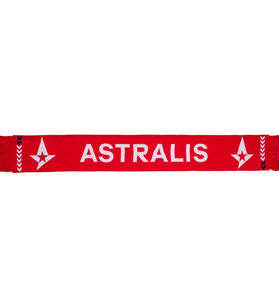 Smart Hummel tørklæde i en strikket kvalitet i rød med et hvidt “Astralis” logo i midten, samt hvide Astralis logoer og de karakteristiske Hummel vinkler, i hver side.