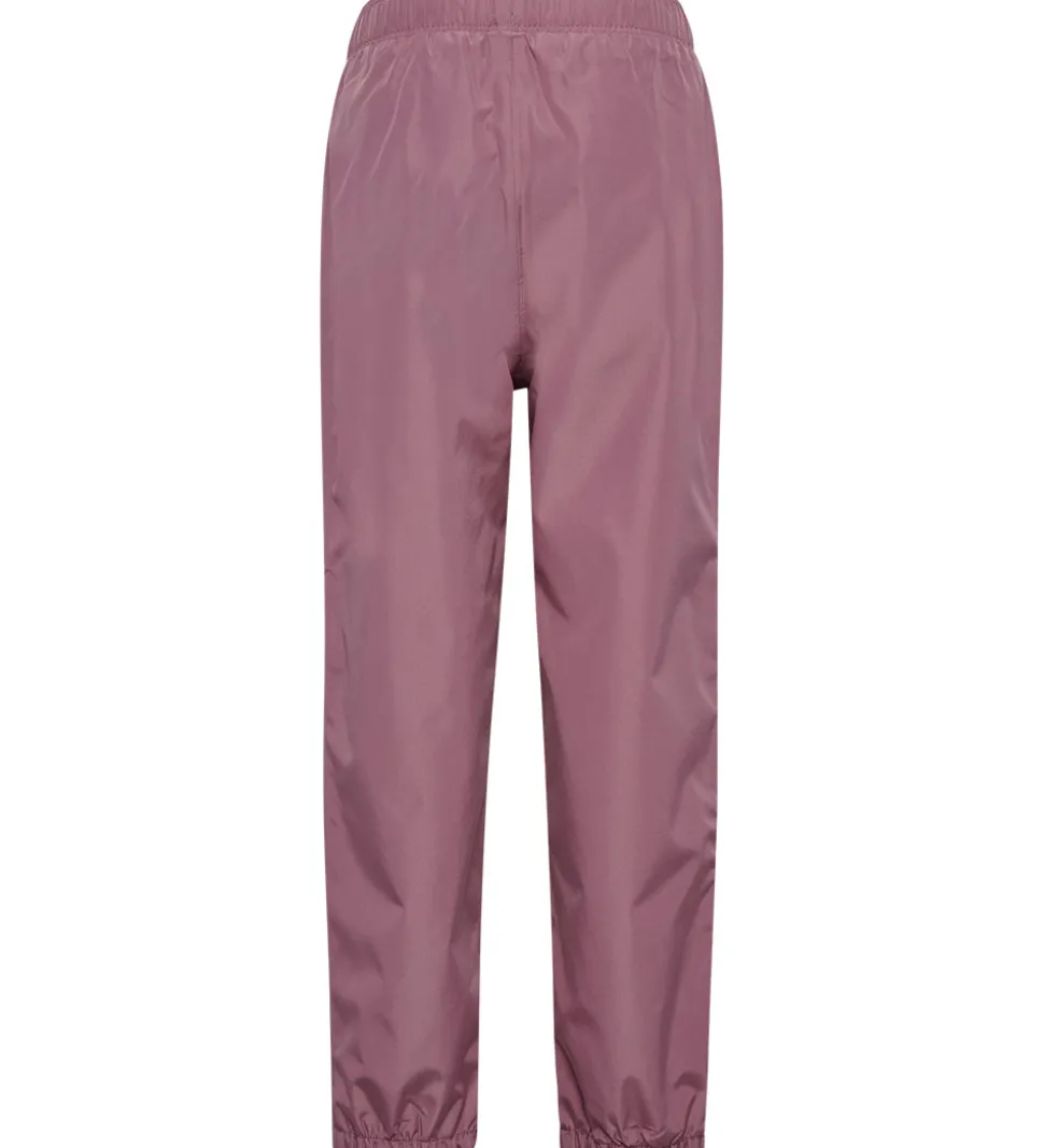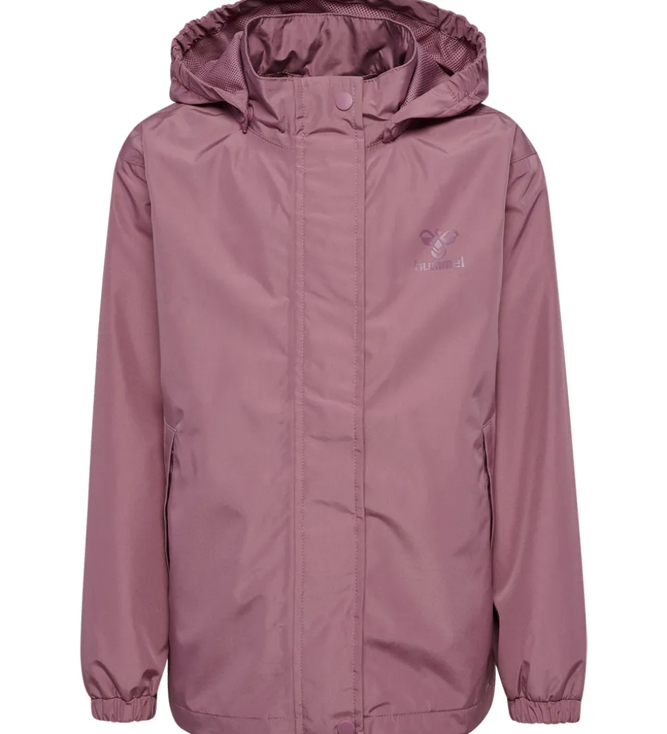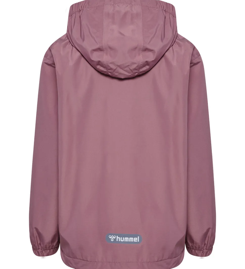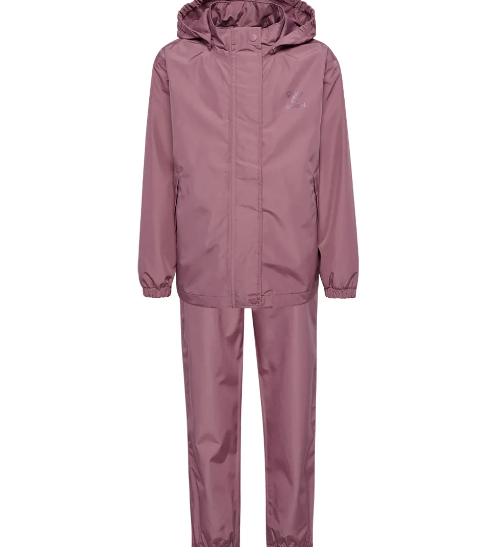 Flot Hummel regntøj i støvet lilla PE med logoprint på venstre bryst og lår. Regntøjet består af en regnjakke og et par regnbukser.