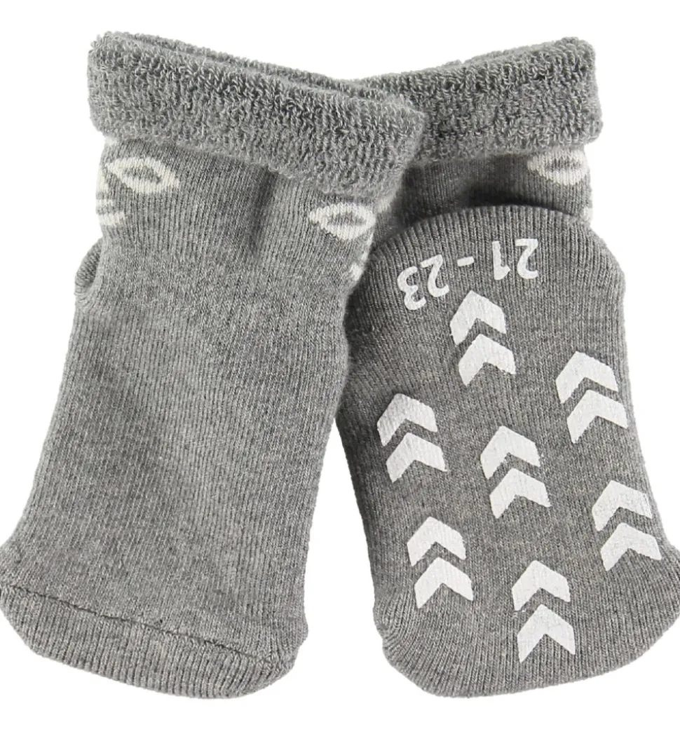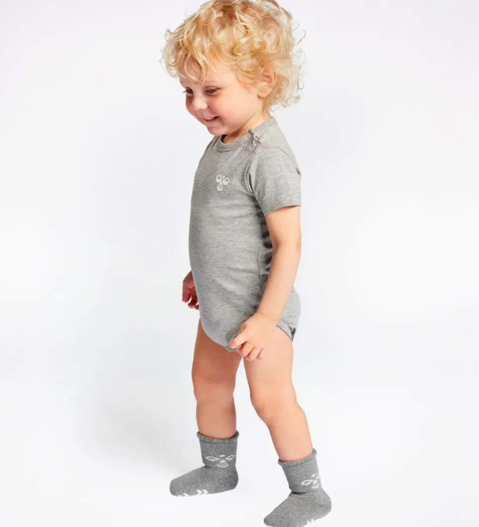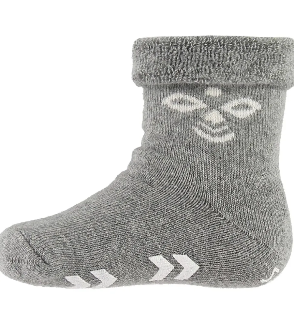Lækre Hummel strømper i Snubbie modellen i gråmeleret med en hvid Hummel bi på skaftet og har gummidutter under foden, så strømperne blive skridsikre.