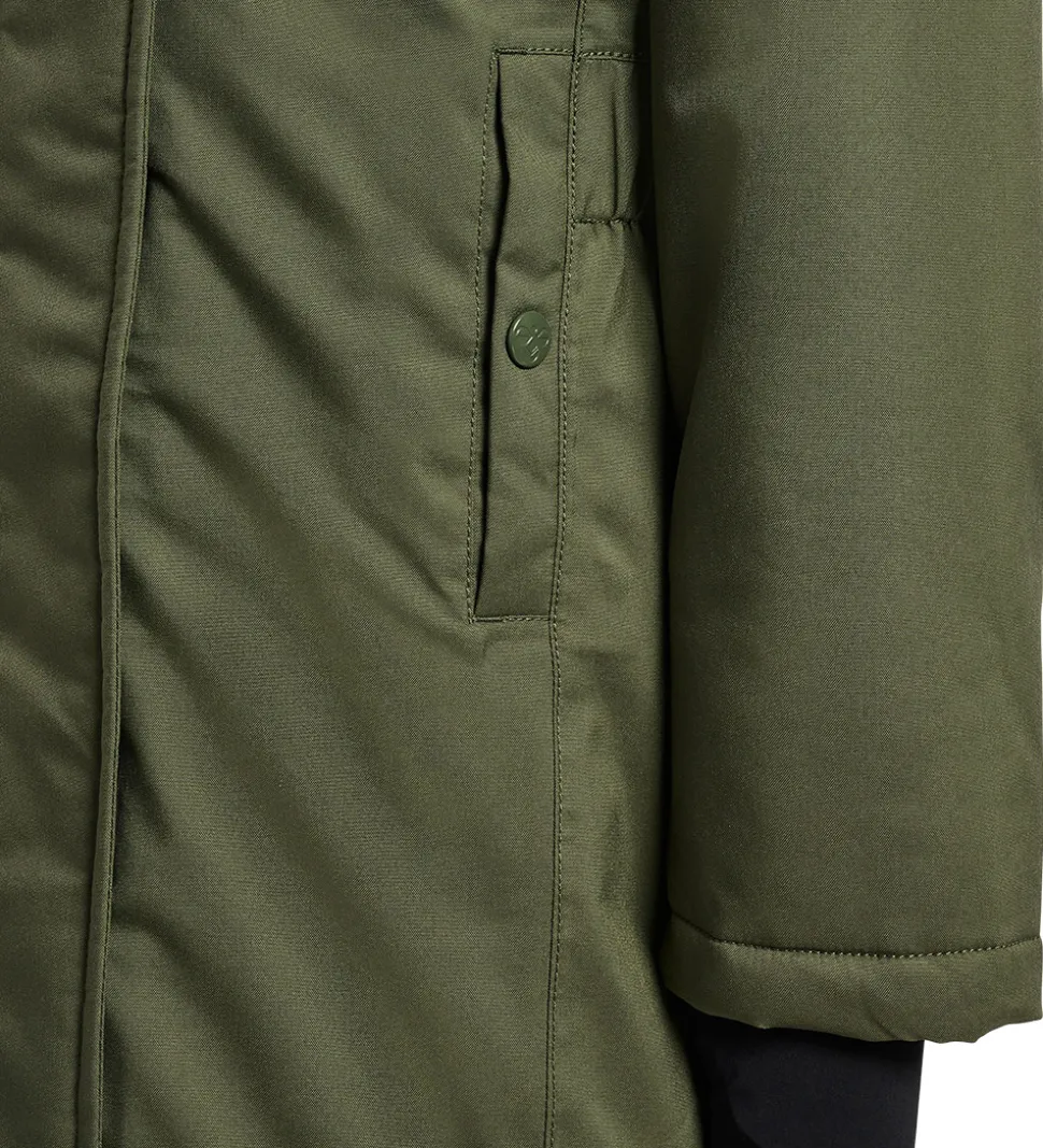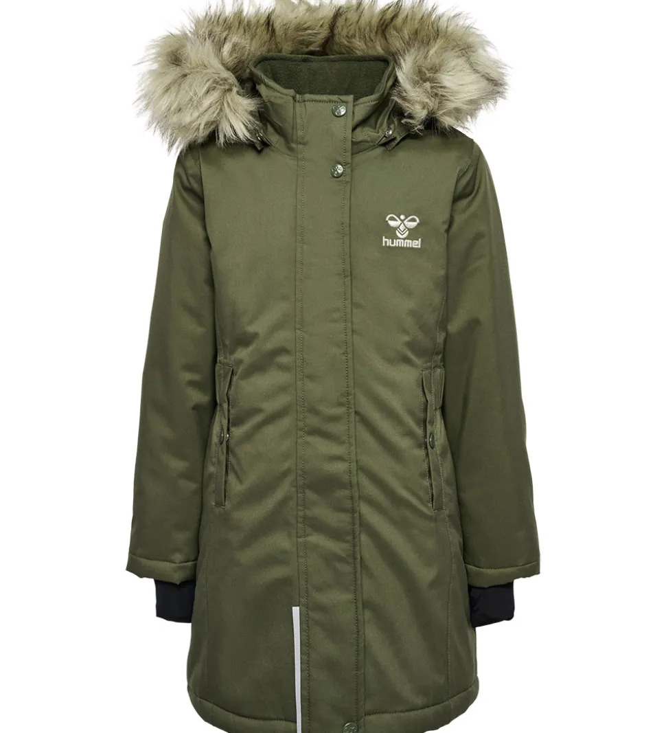 Hummel vinterfrakken har sorte polyester-snefang med hul til tommelfingeren i armåbningerne. I taljen er vinterfrakken justeret ind med en elastikkant, som sikrer en god og behagelig pasform samt et mere figursyet snit. Derudover har vinterfrakken to fleeceforede trykknapslommer på fronten.