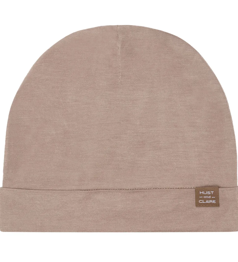 Elegant Hust and Claire hue i en diskret brun farvetone. Huen har en enkel struktur med en opfoldet kant forneden. Der er et lille, rektangulært logomærke i brun med hvid tekst på siden. Hust and Claire leverer med denne hue et design, der er tidløst og stilrent.