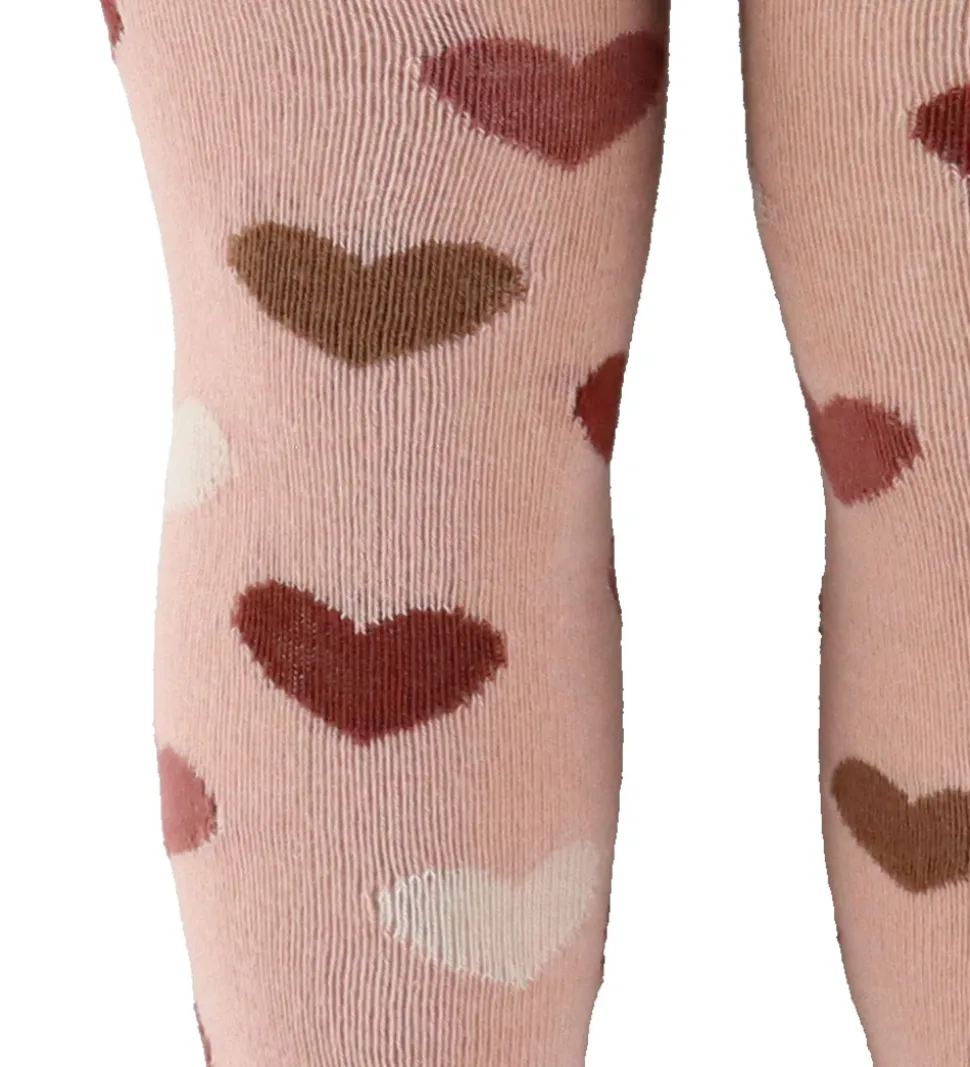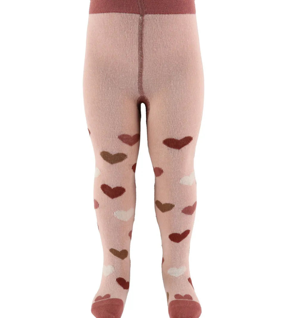 Fine Hust and Claire strømpebukser i en støvet rosa farve med et mønster af små, hjerter i forskellige nuancer. Strømpebukserne har en behagelig elastik i taljen, der sikrer en god pasform.