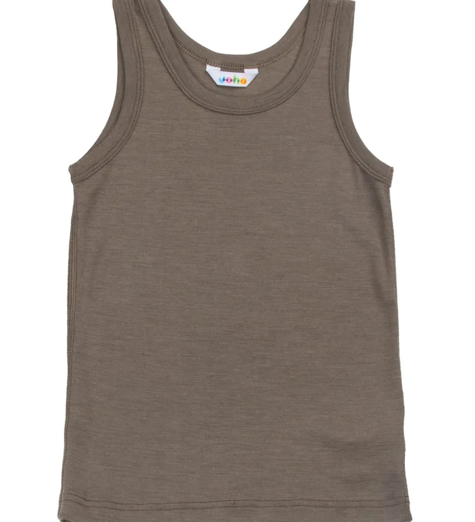 Joha undertrøjen er uden ærmer og har brede skulderstropper. I arm- og halsåbningerne er der smalle ribkanter og den er i en lækker blanding af uld og silke.