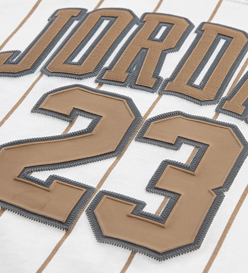 Flot Jordan sweatsæt, der består af en cardigan og et par sweatpants i beigefarvet sweat med hvide detaljer samt en hvid t-shirt med smalle, beigefarvede striber.