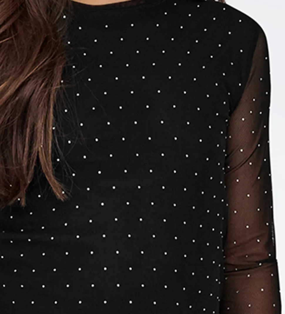 Elegant Kids Only bluse i sort mesh med små rhinsten i sølv. Blusen har lange, semitransparente ærmer, der skaber et let og luftigt udtryk. Den runde halsudskæring og bølgede kant nederst fuldender blusens stilfulde design. Blusen består af to lag i kroppen, så den ikke fremstår gennemsigtig.