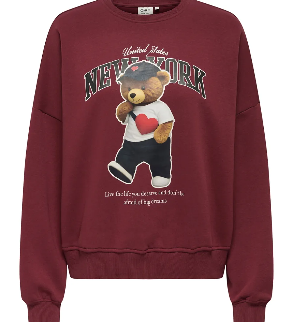 Stilfuld Kids Only sweatshirt i en dyb bordeaux farve med et charmerende print af en bamse iført tøj. Under bamsen ses teksten “Live the life you deserve and don’t be afraid of big dreams”. Kids Only sweatshirten har lange ærmer og en rund hals. Indvendigt er der blødt, børstet bomuld.