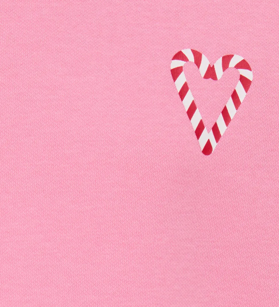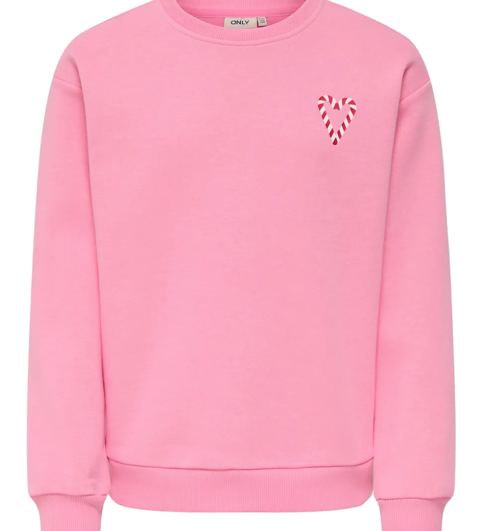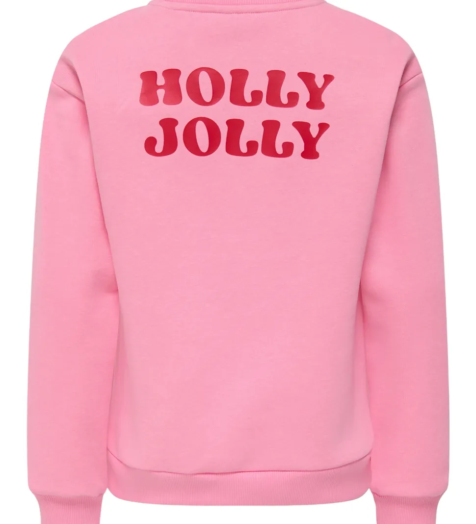 Elegant Kids Only sweatshirt i rosa med et unikt hjerteprint i form af en slikstok i rød og hvid på forsiden. På ryggen er et stort print af teksten “Holly Jolly” i rød. Kids Only sweatshirten har lange ærmer, en rund hals og ribkanter ved både ærmer og bund.