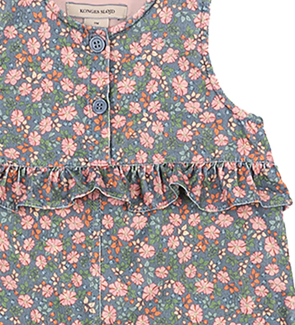 Charmerende Konges Sløjd buksedragt i mørkeblå med et farverigt blomsterprint i rosa og grønne nuancer.