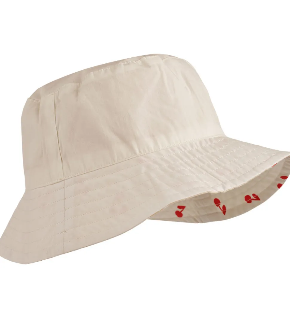 Sød Liewood bøllehat i et vendbart design, hvor den ene side er beige med rødt kirsebærprint, mens den anden er i ensfarvet beige.