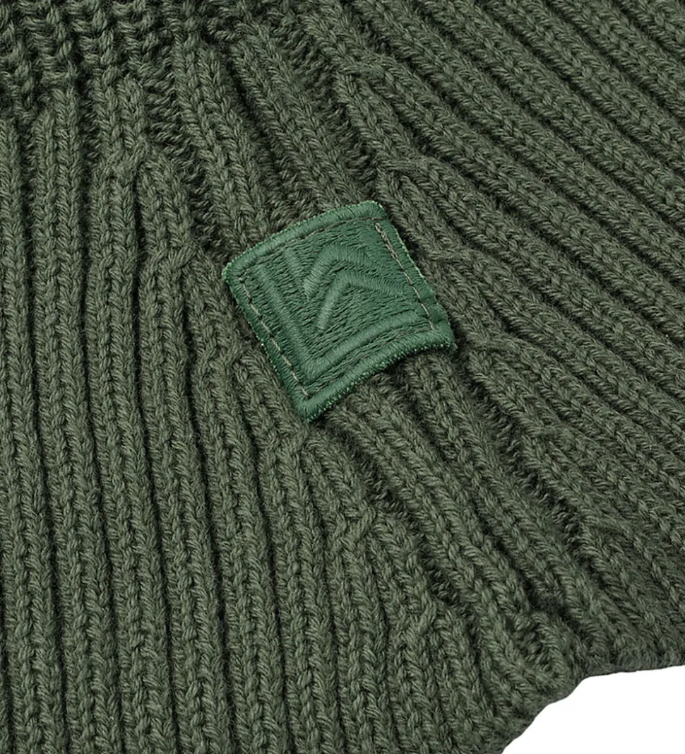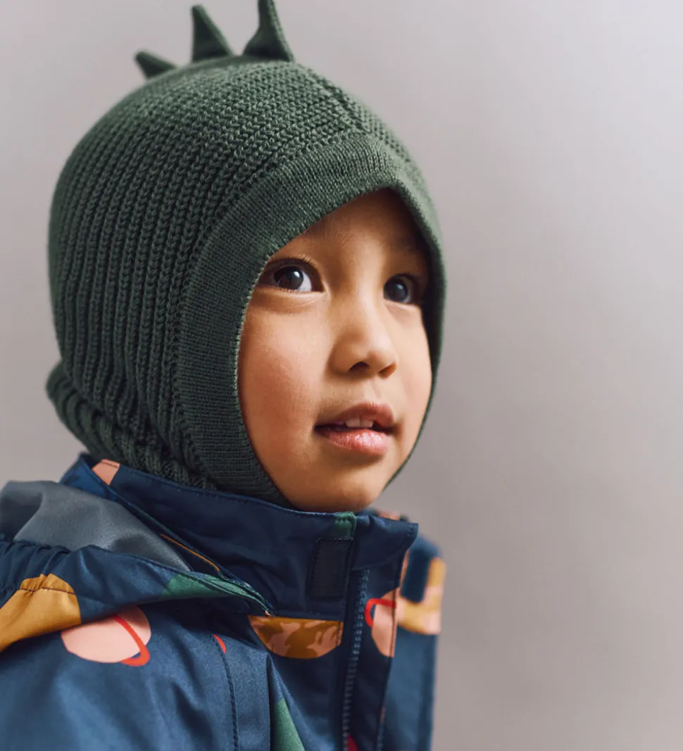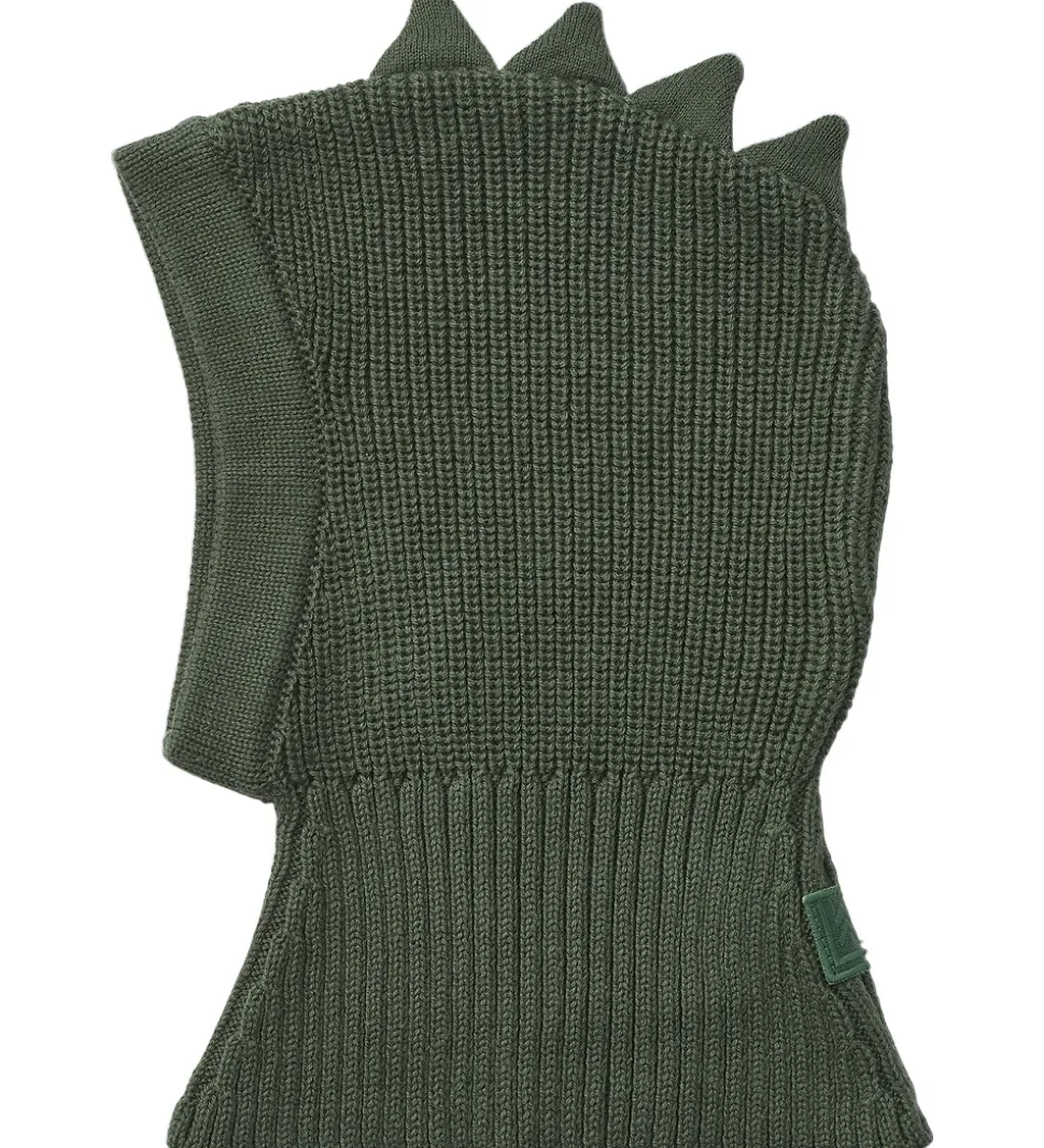 Smart Liewood elefanthue i en dyb grøn farve med ribstruktur. Liewood elefanthuen har en rund hovedform med små takker langs toppen, så den ligner en dinosaur. Elefanthuen består af et enkelt lag i en strikket kvalitet.