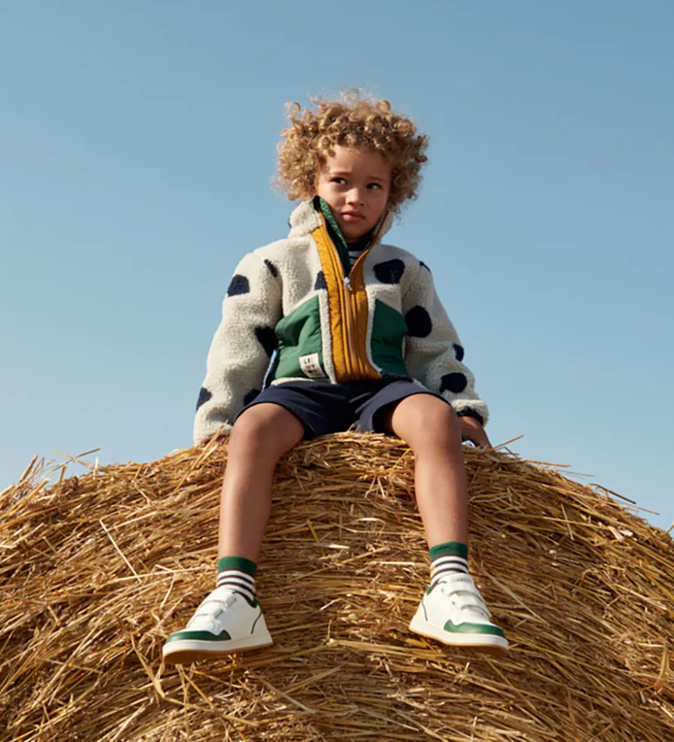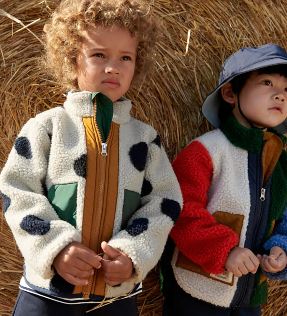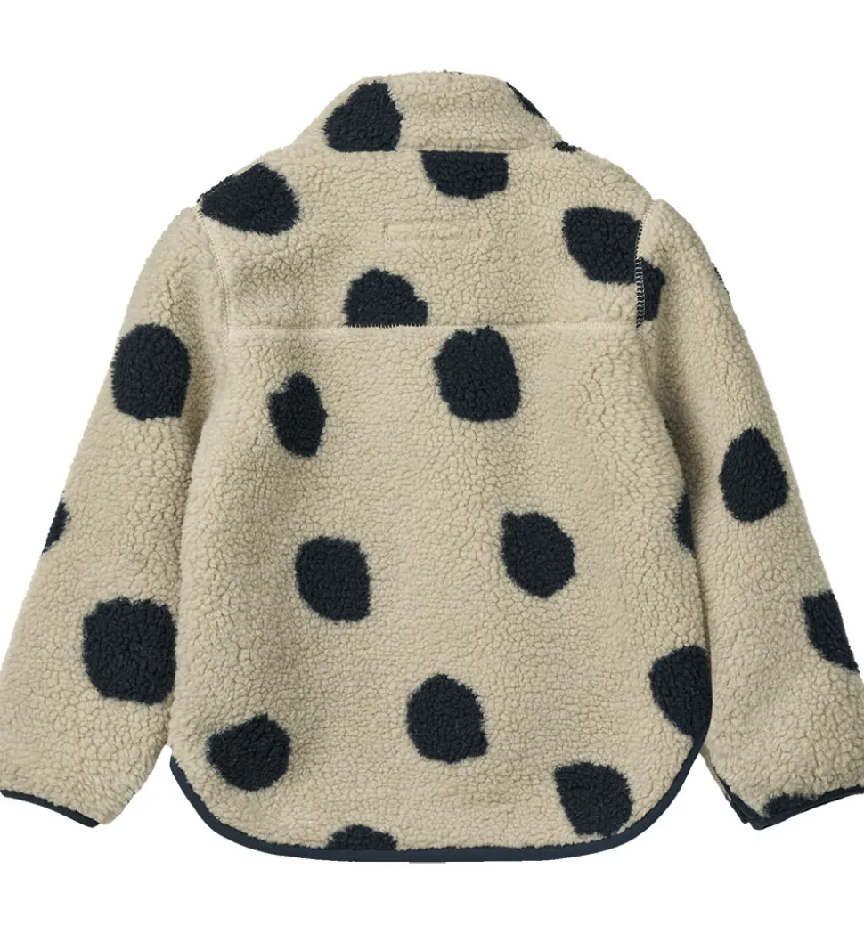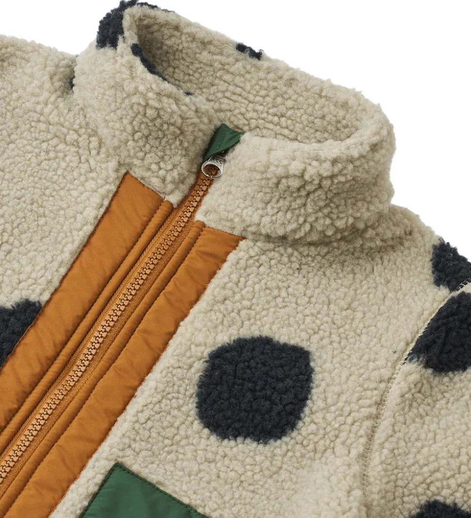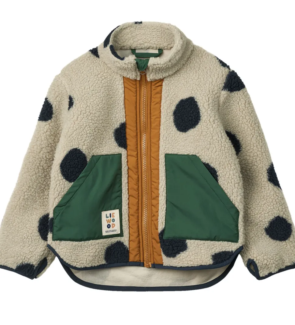 Smart Liewood fleecejakke i gråbrunt teddyfleece med store navyblå prikker og detaljer i navyblå, grøn og karrygul.