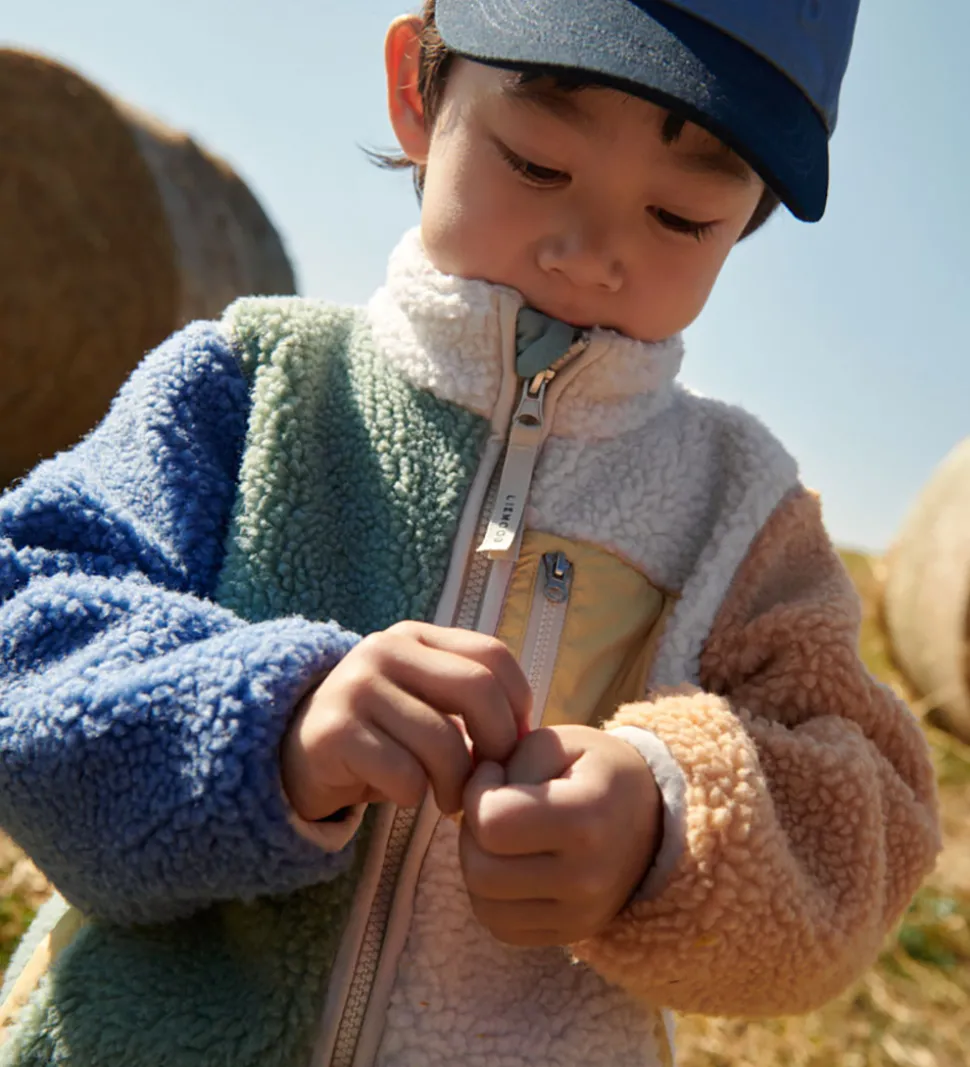 Sej Liewood fleecejakke i teddyfleece i en farvesammensætning af hvid, støvet grøn, blå, lys orange og gul.