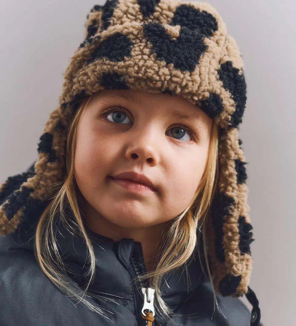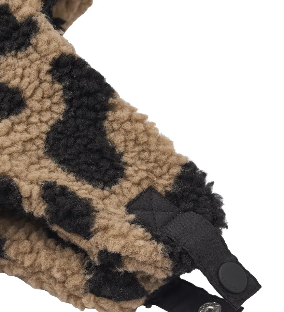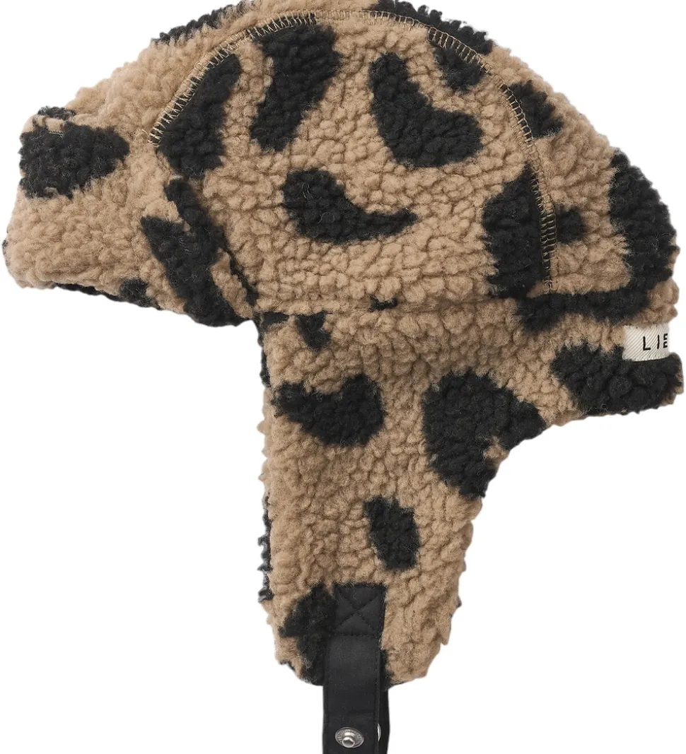 Lækker Liewood hue af blødt teddyfleece med leopardmønster i beige og sort.