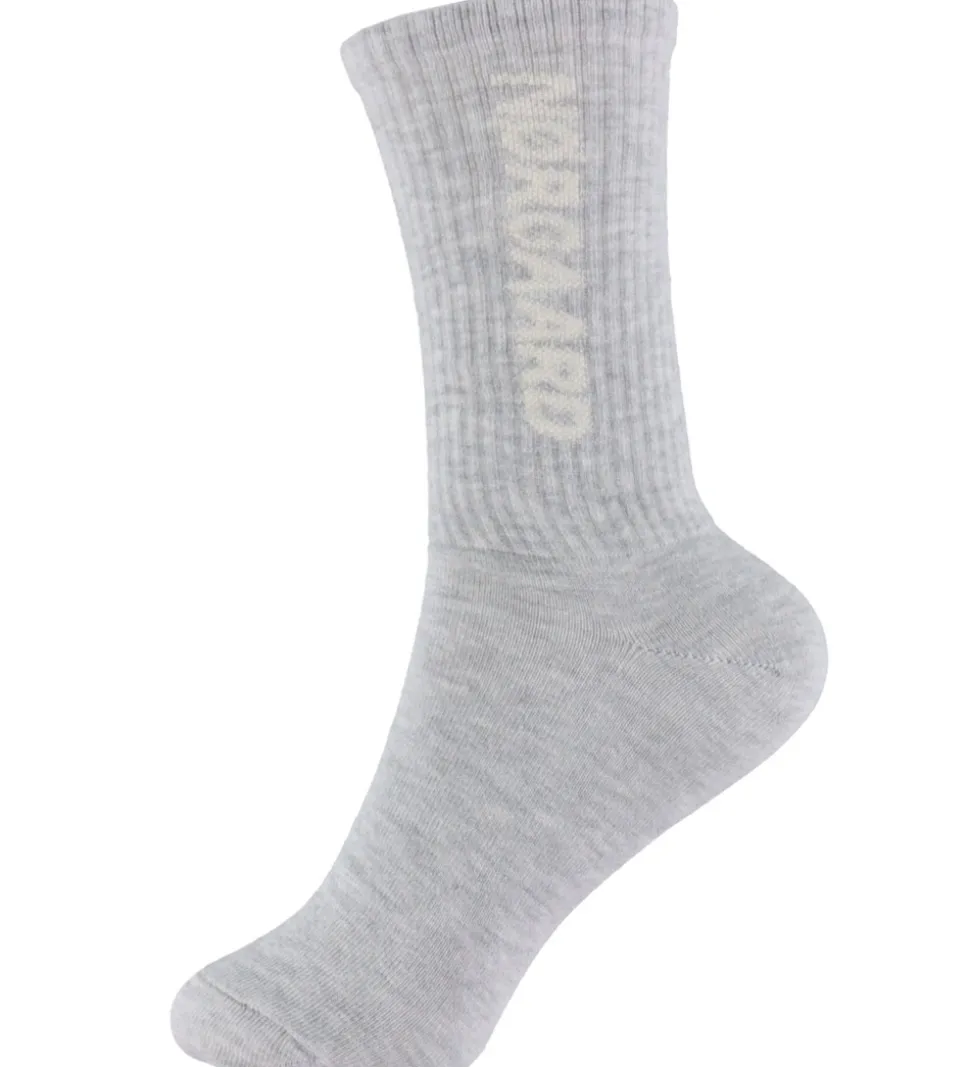 Praktiske Mads Nørgaard strømper solgt i en 4-pak i grøn, navyblå, grå og brun med et stilfuldt logo på skaftet i forskellige farver. Strømperne har en klassisk ribbet struktur og en bred elastisk ribkant øverst på skaftet.