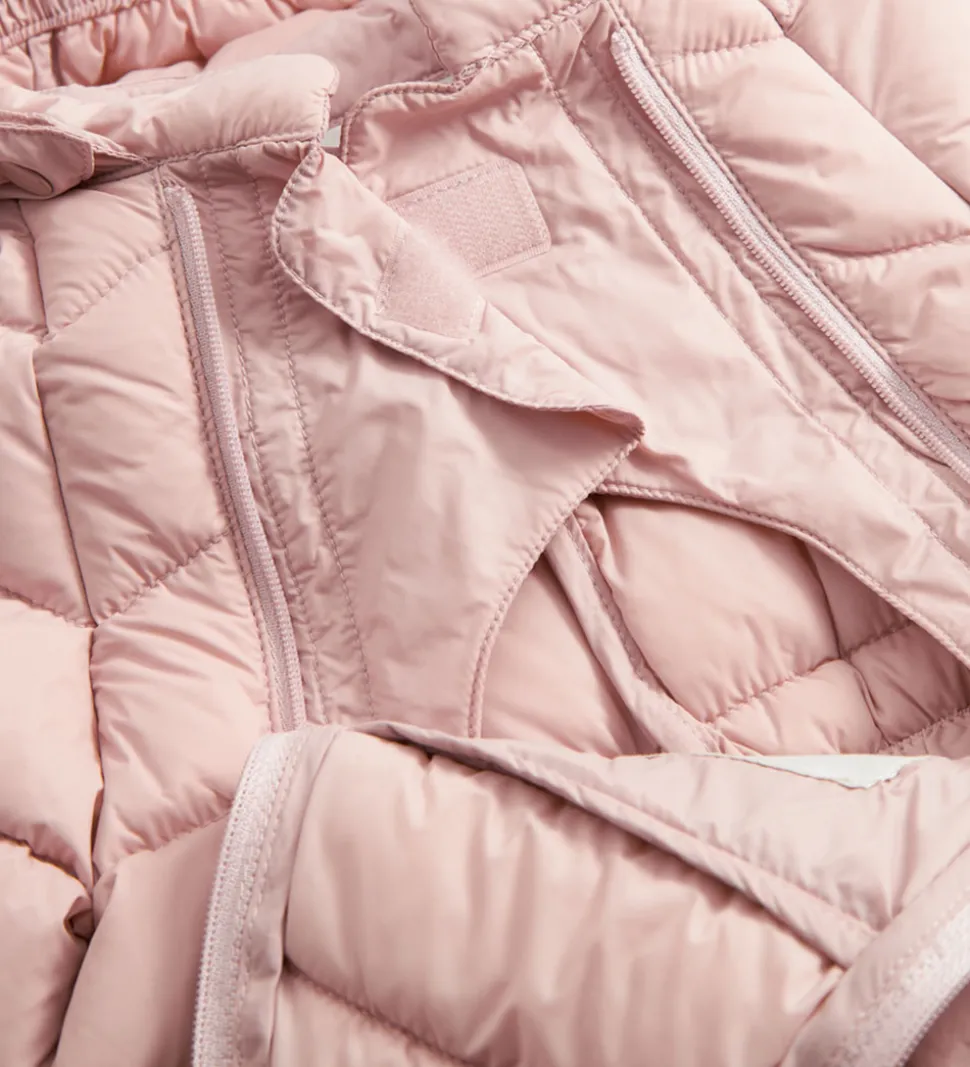Flyverdragten har et glatvævet for, og den er vatteret med lune dun og fjer.