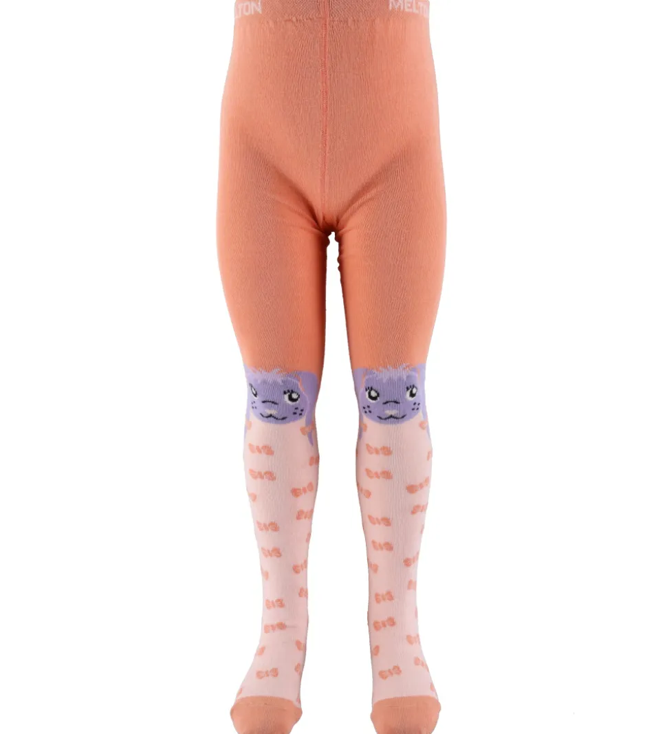 Charmerende Melton strømpebukser i en lys, orange nuance med et sødt katteprint ved knæene.