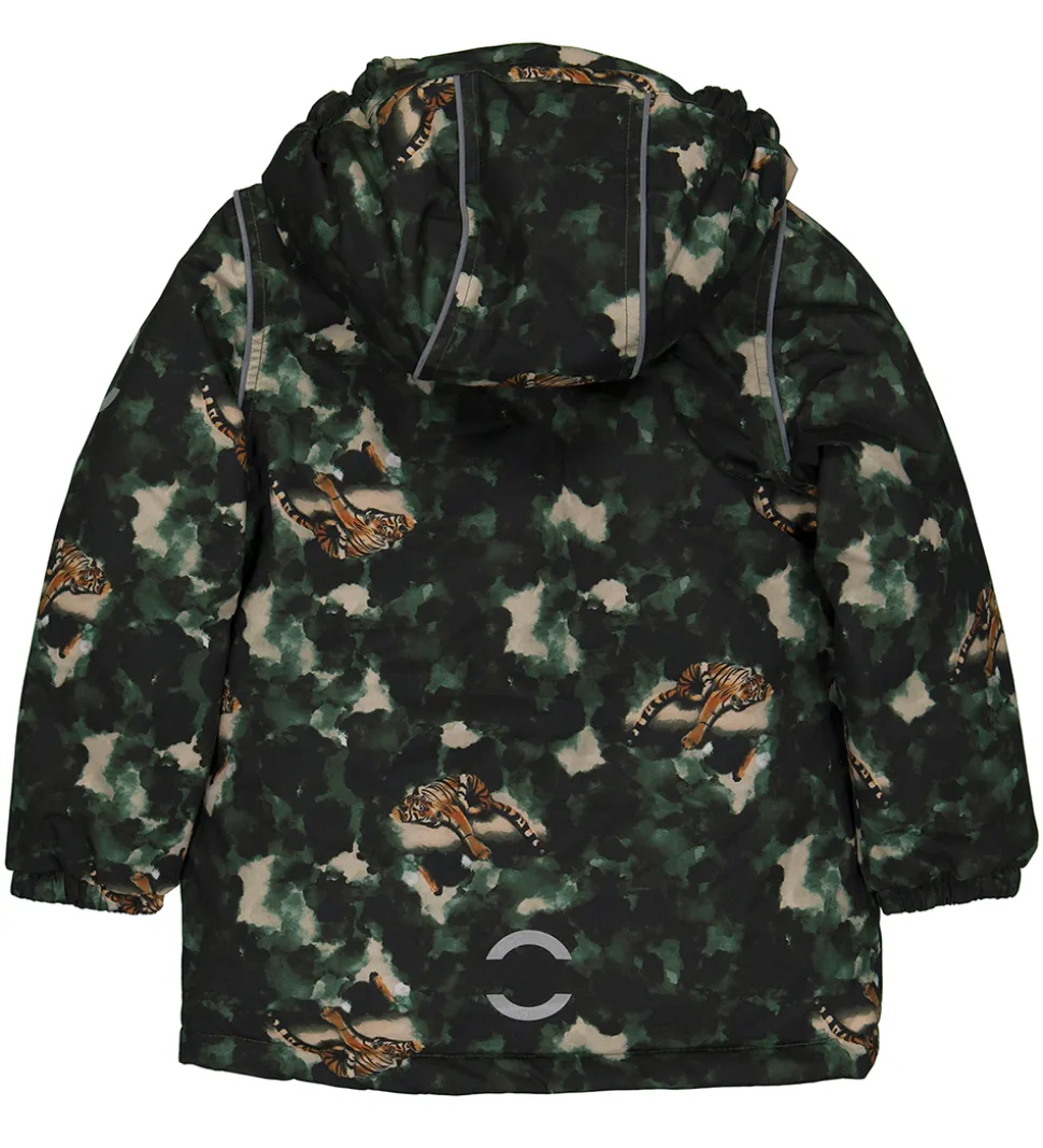 Skøn Mikk-Line vinterjakke med et camouflageprint i grønne og beige nuancer og med tigere.