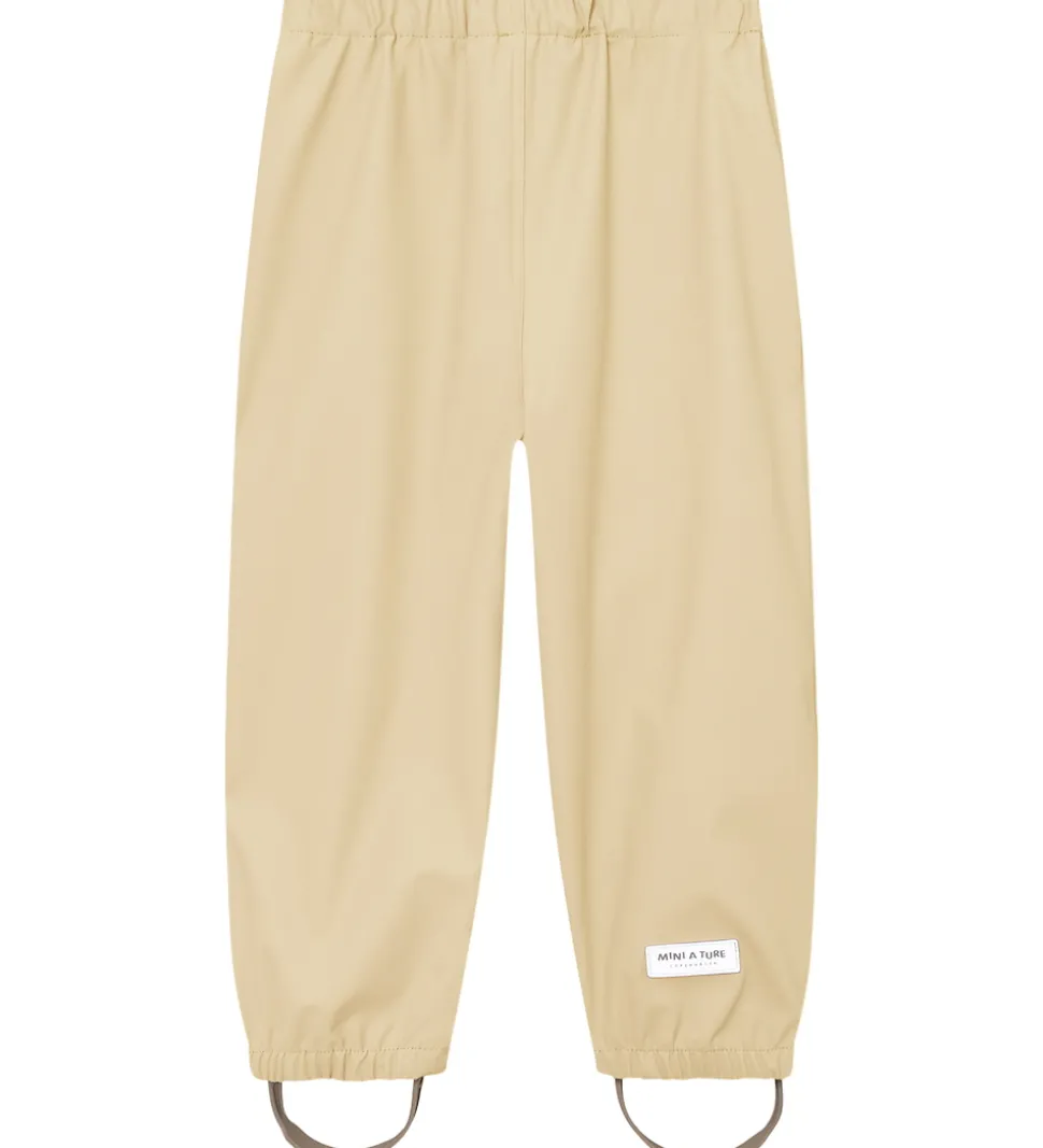 Fint Mini A Ture regntøj bestående af en regnjakke og et par regnbukser i ensfarvet lys beige PU.