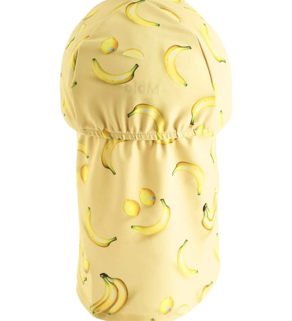 Flot Molo badehat i gul med et print af bananer. Molo badehatten har en bred skygge foran og en skygge i nakken, så barnet er godt beskyttet mod solens stråler. Badehatten findes under hagen med bindebånd. Den har et praktisk UV-filter på 50+.
