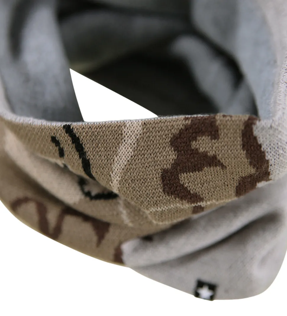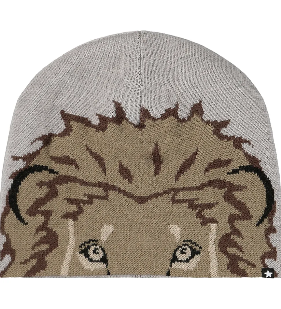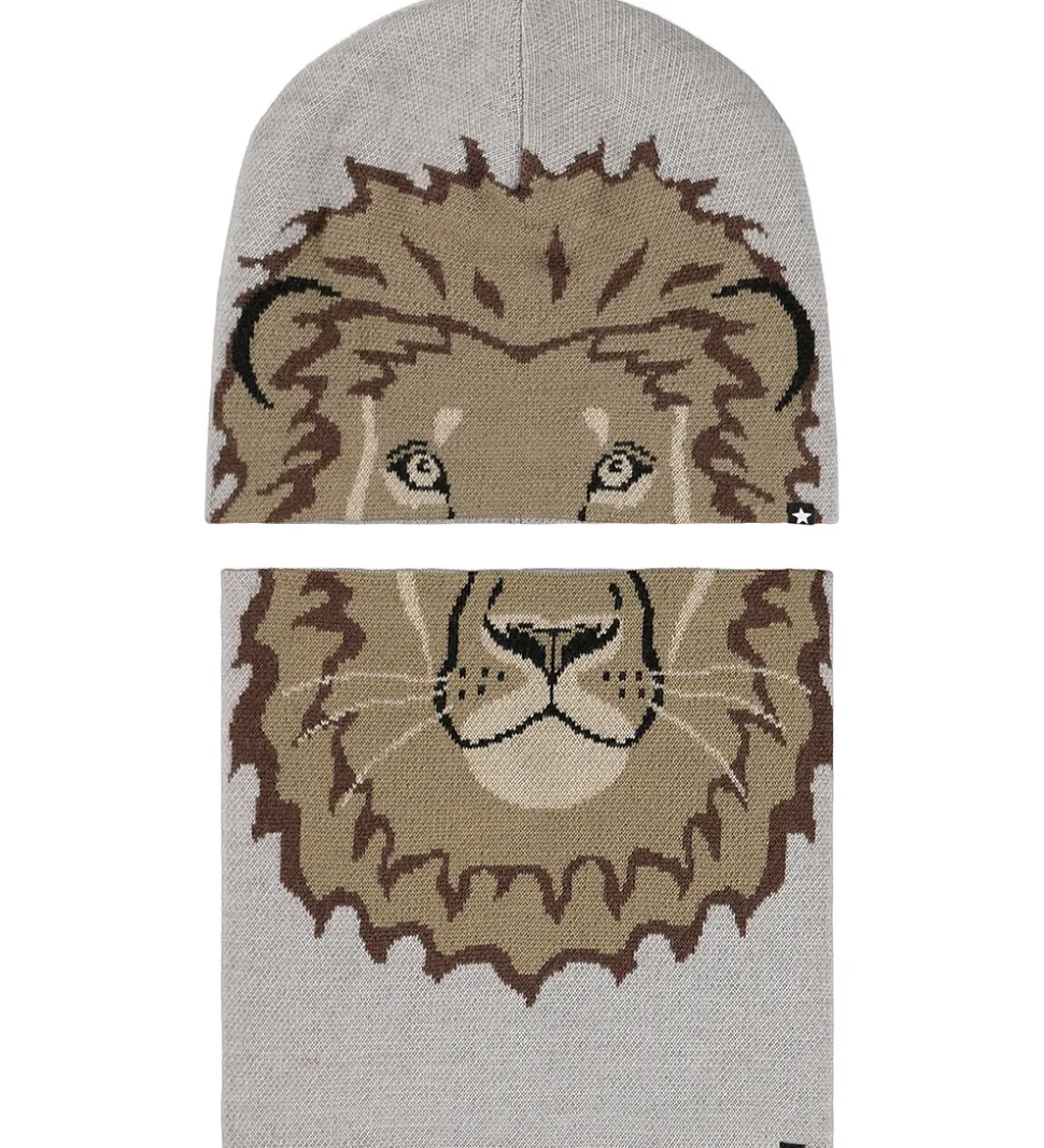 Sejt Molo sæt bestående af hue og tube i grå med print, der tilsammen udgør en beige løve.