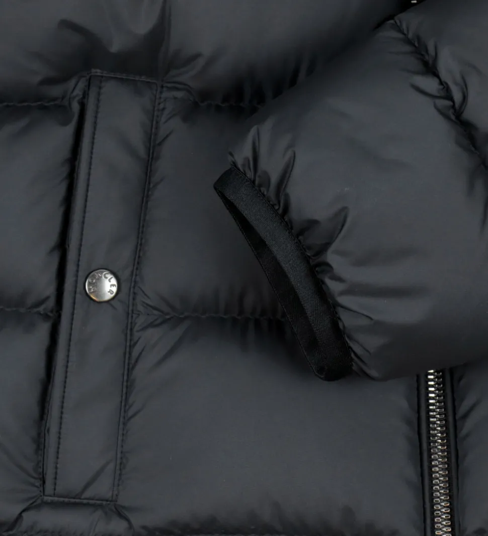 Lækker Moncler dunjakke i ensfarvet sort, med teksten Moncler på venstre bryst, og øverst på venstre ærme er der et filt-mærke med et Moncler-logo.