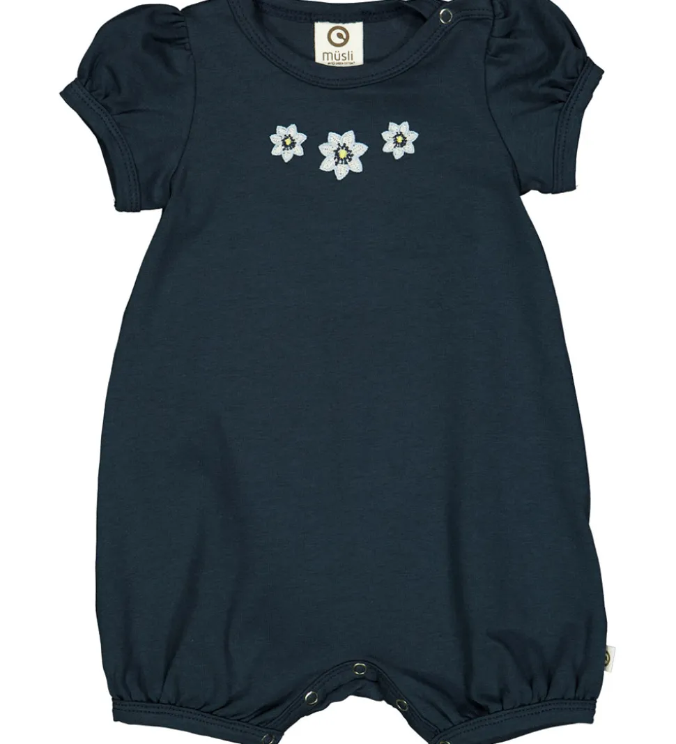 Charmerende Müsli sommerdragt i en dyb, blå farve med korte ærmer og praktiske trykknapper. Dragtens front prydes af tre, broderede blomster, som tilføjer et fint og dekorativt touch. Müsli kombinerer stil og komfort.