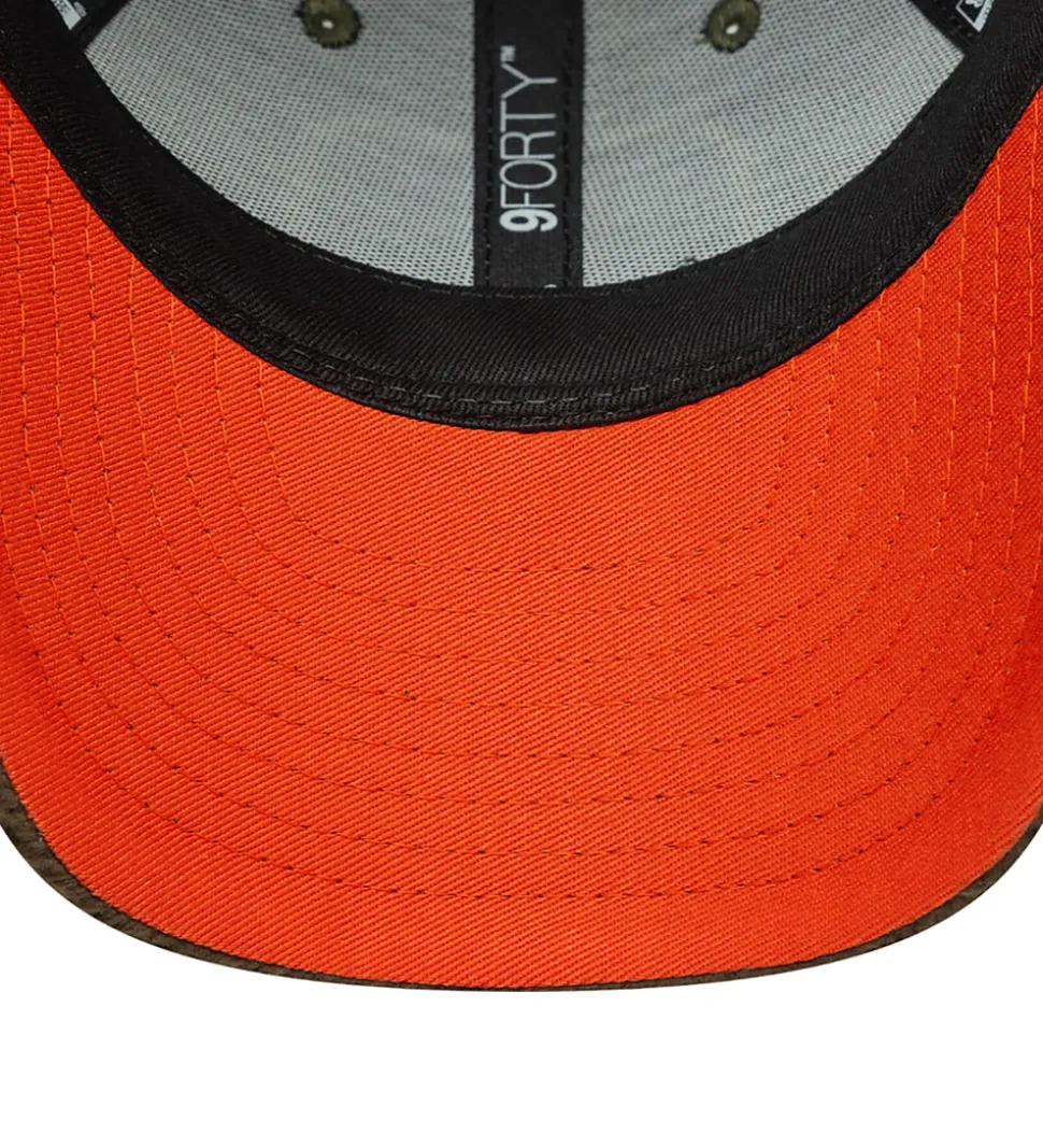 Sej New Era kasket i olivengrøn med et markant broderet badge foran, der viser et bjergmotiv med teksten “New Era Outdoor”. Kasketten har en skygge med plys på toppen.