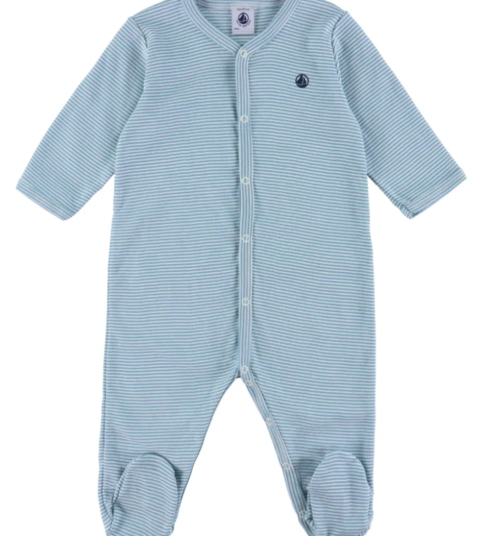 Petit Bateau natdragterne har lange ærmer og ben, og den har faste fødder. Natdragterne har smalle ribkanter i alle åbninger, og den kan åbnes fortil med gennemgående trykknapper samt mellem benene med yderligere trykknapper.