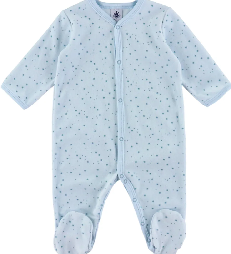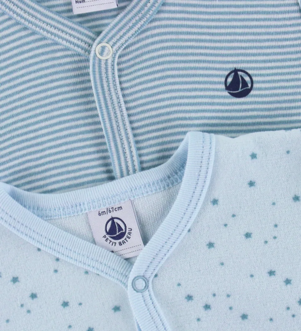 Behagelige natdragter fra Petit Bateau solgt i en 2-pak. Den ene natdragt har fine smalle striber i blå og hvid, mens den anden er i en blød velour med et flot alloverprint af mørkeblå stjerner på lyseblå baggrund.