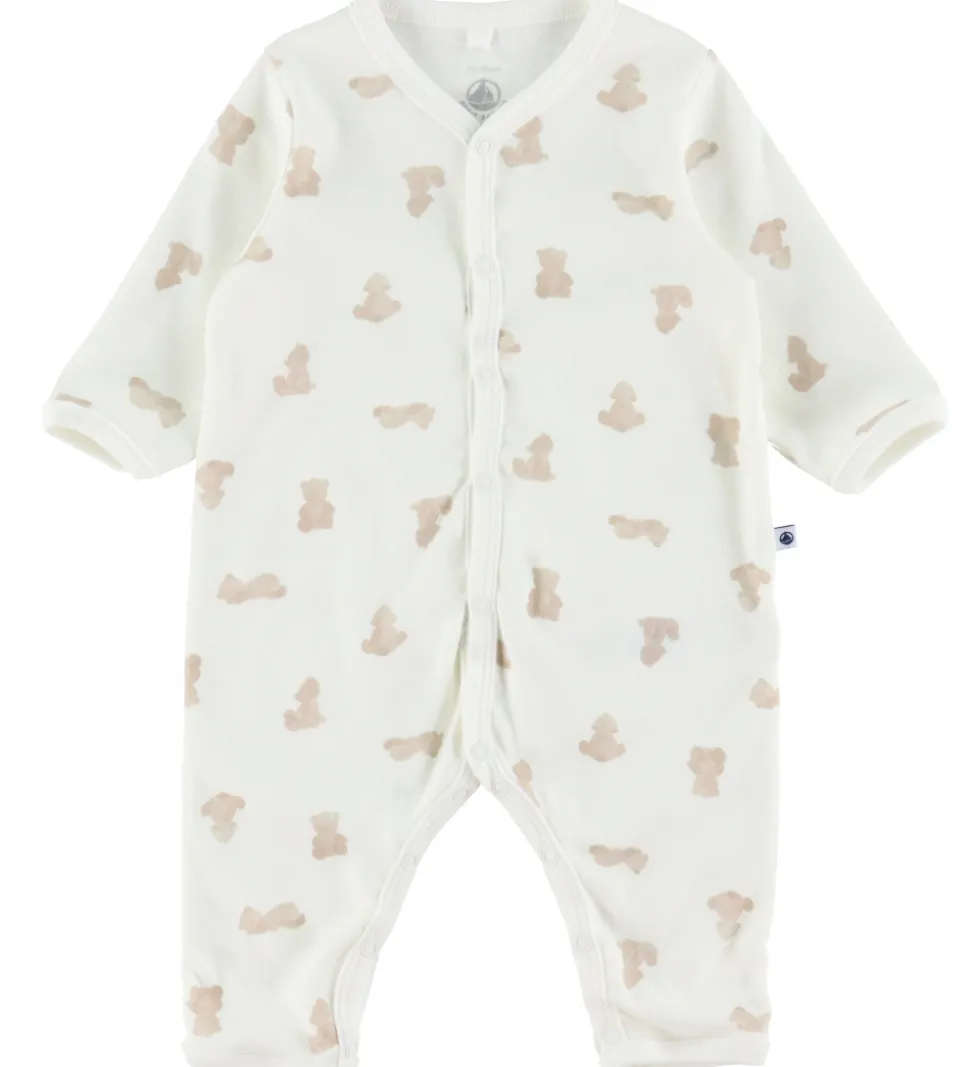 Charmerende Petit Bateau natdragt i en lys cremefarve med et mønster af brune bamser. Den har lange ærmer og ben, og den lukkes med trykknapper ned ad fronten og hele vejen ned ad buksebenene. Petit Bateau prioriterer detaljer og kvalitet i hver enkel natdragt.