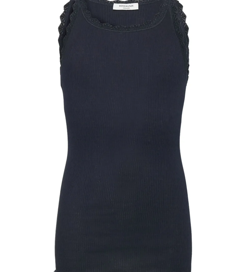 Rosemunde toppen er en lang model, som går godt ned over hofterne. Den er helt uden ærmer, og i ærmegabene og i halsåbningen er der søde blondekanter.