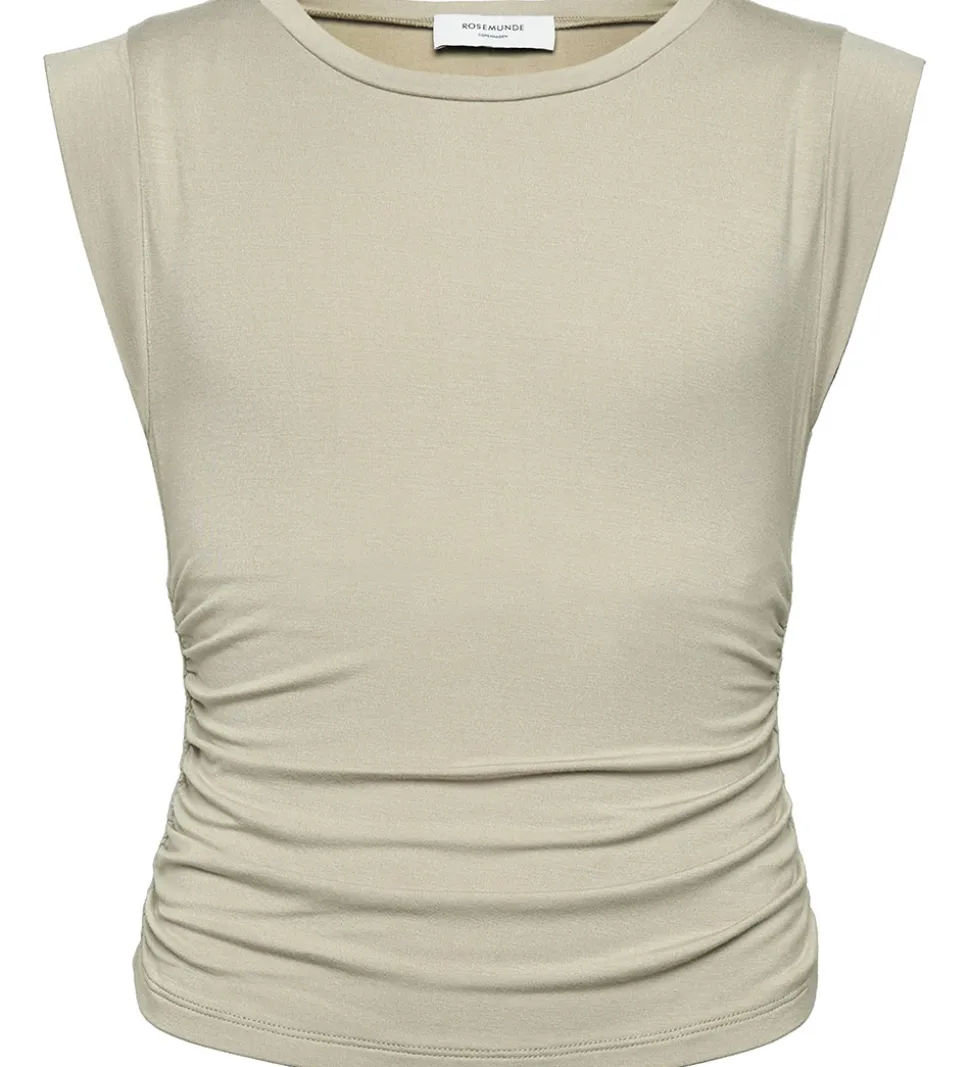 Rosemunde toppen er uden ærmer, og den har dekorative rynkedetaljer i siderne.