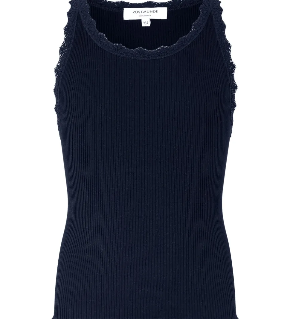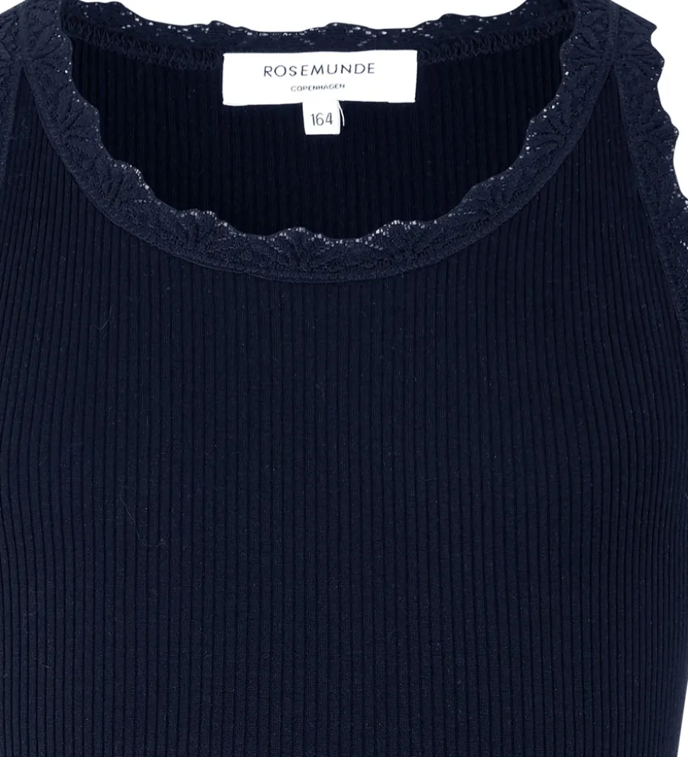 Skøn Rosemunde top i en navyblå ribstruktur med flotte blonder i skuldrene og halsen.