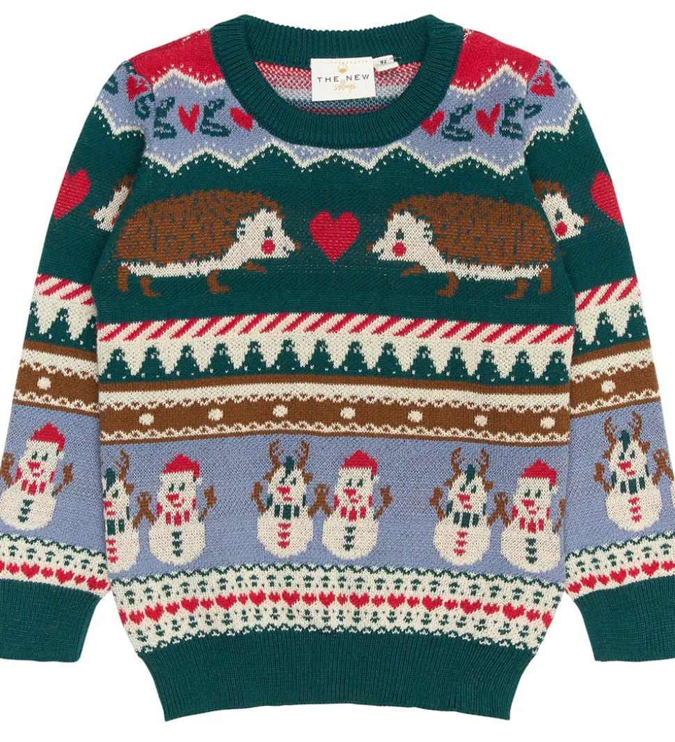 Blusen har et motiv af pindsvin, snefnug og snemænd, der står foran en dyb grøn baggrund kombineret med røde, blå og brune nuancer. The New blusen har lange ærmer og ribkanter for et klassisk look. Den er dekoreret med fine hjertedetaljer og stribekanter, som giver et unikt design.