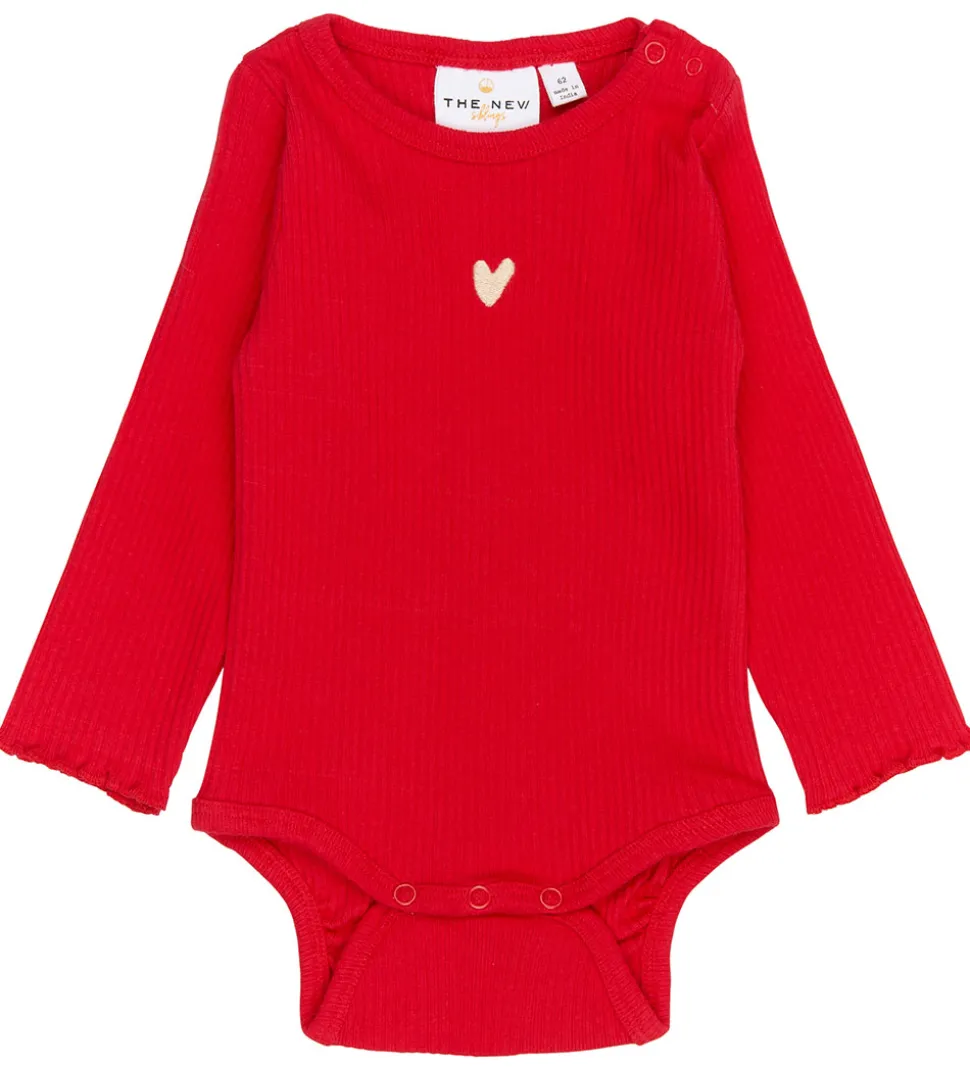Flot The New body med lange ærmer i en klar, rød farve. Bodyen har et enkelt hjertebroderi foran, som giver et elegant udtryk. Bodyen er fremstillet i et ribbet materiale, der tilføjer en moderne struktur.