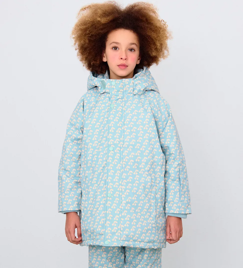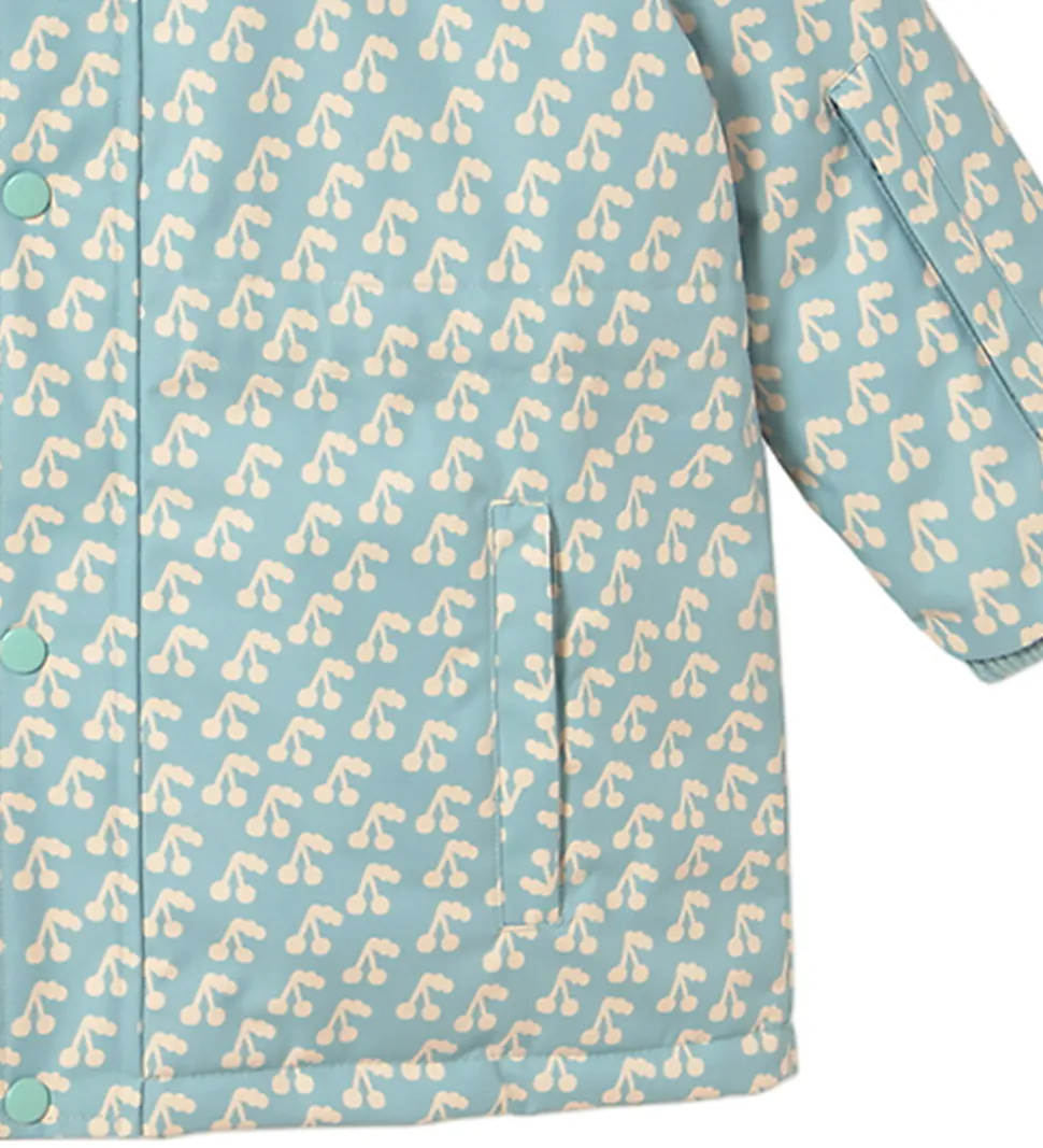 Sød Tiny Cottons vinterjakke i lyseblå med et flot alloverprint af hvide kirsebær.