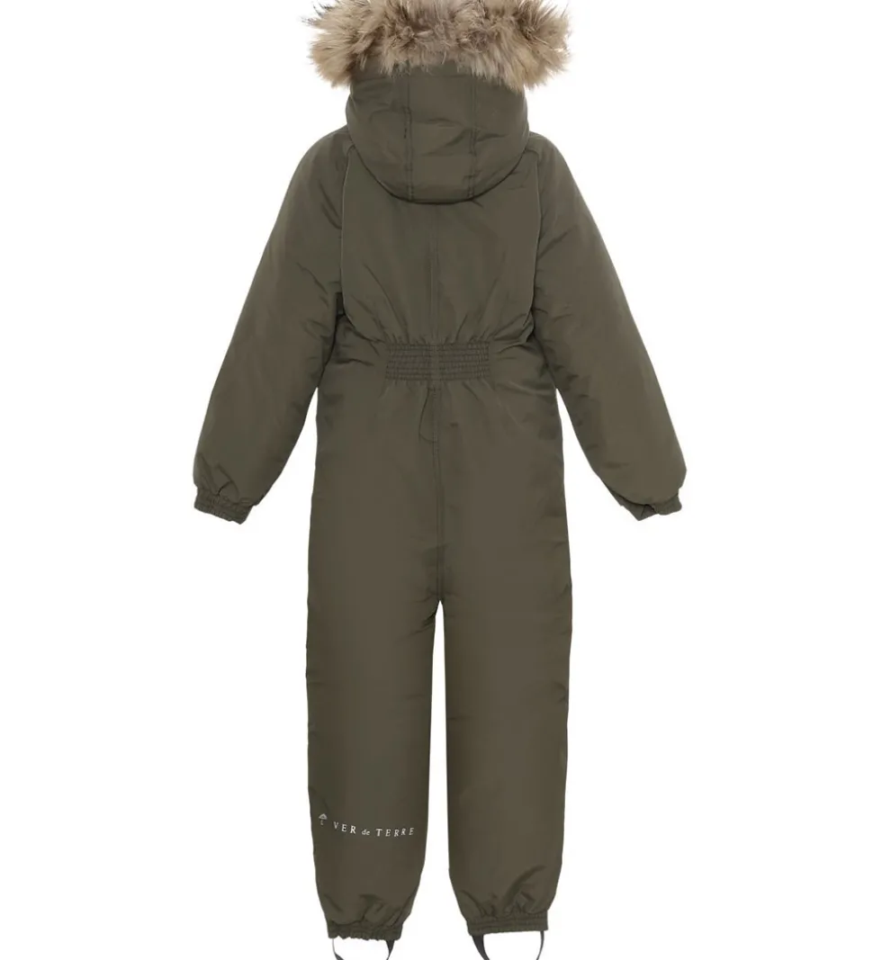 Lækker Ver de Terre flyverdragt i ensfarvet mørk armygrøn, og fortil i højre side er der broderet et diskret logo. Flyverdragten har en hætte med en flot kant af pels.