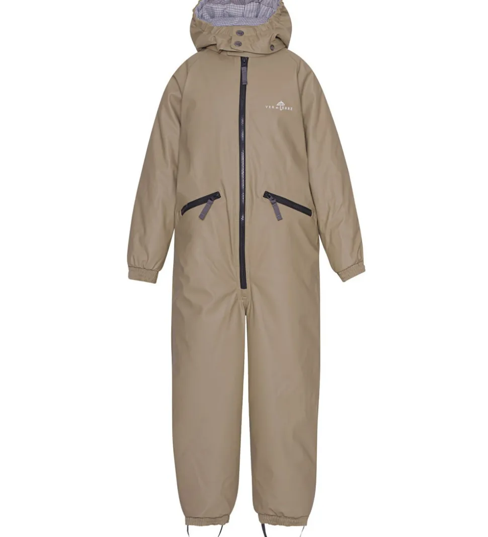 Lækker Ver de Terre flyverdragt i ensfarvet lysebrun med en vandtæt PU-overflade og med sorte lynlåse.