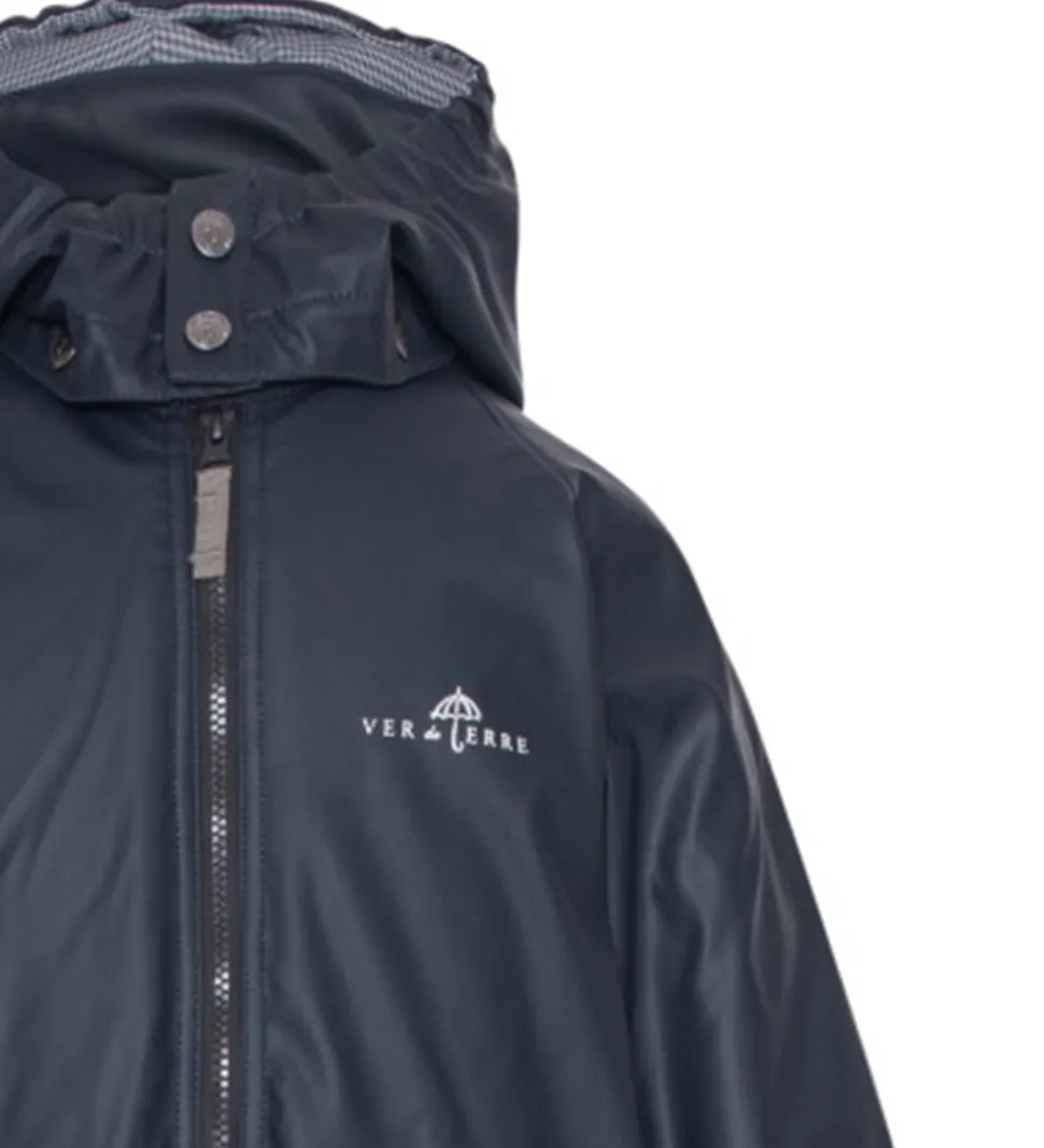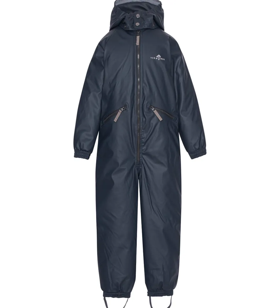 Flot Ver de Terre flyverdragt i ensfarvet navy med en vandtæt PU-overflade og med sorte lynlåse.